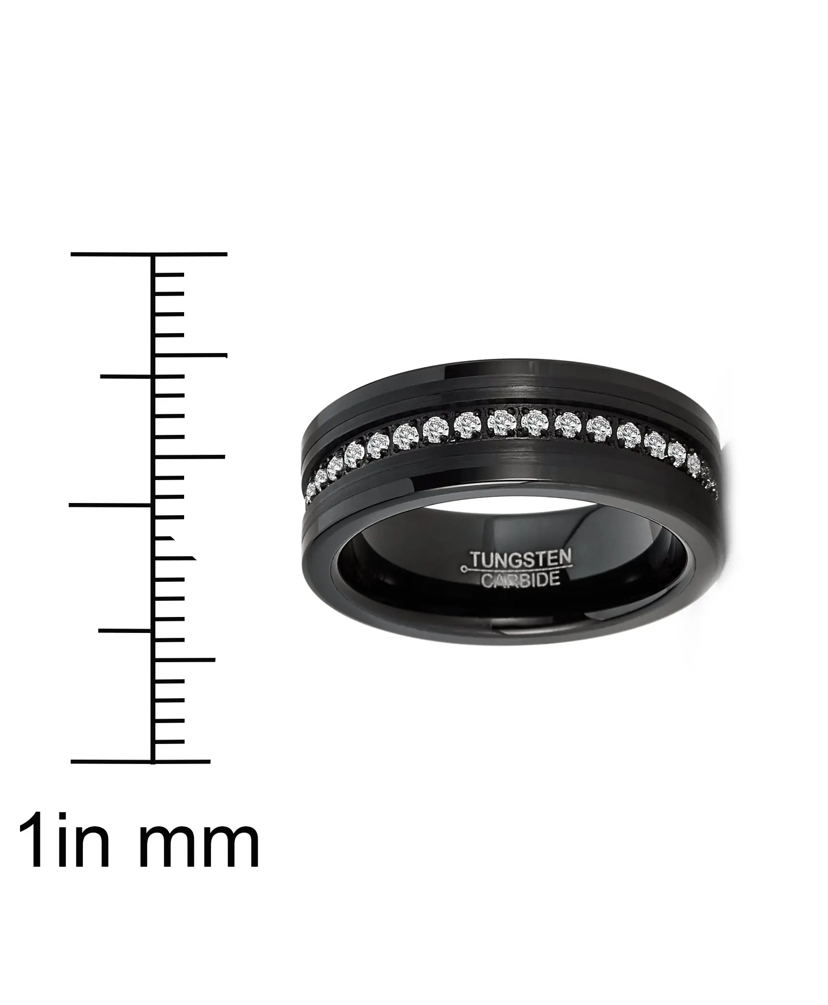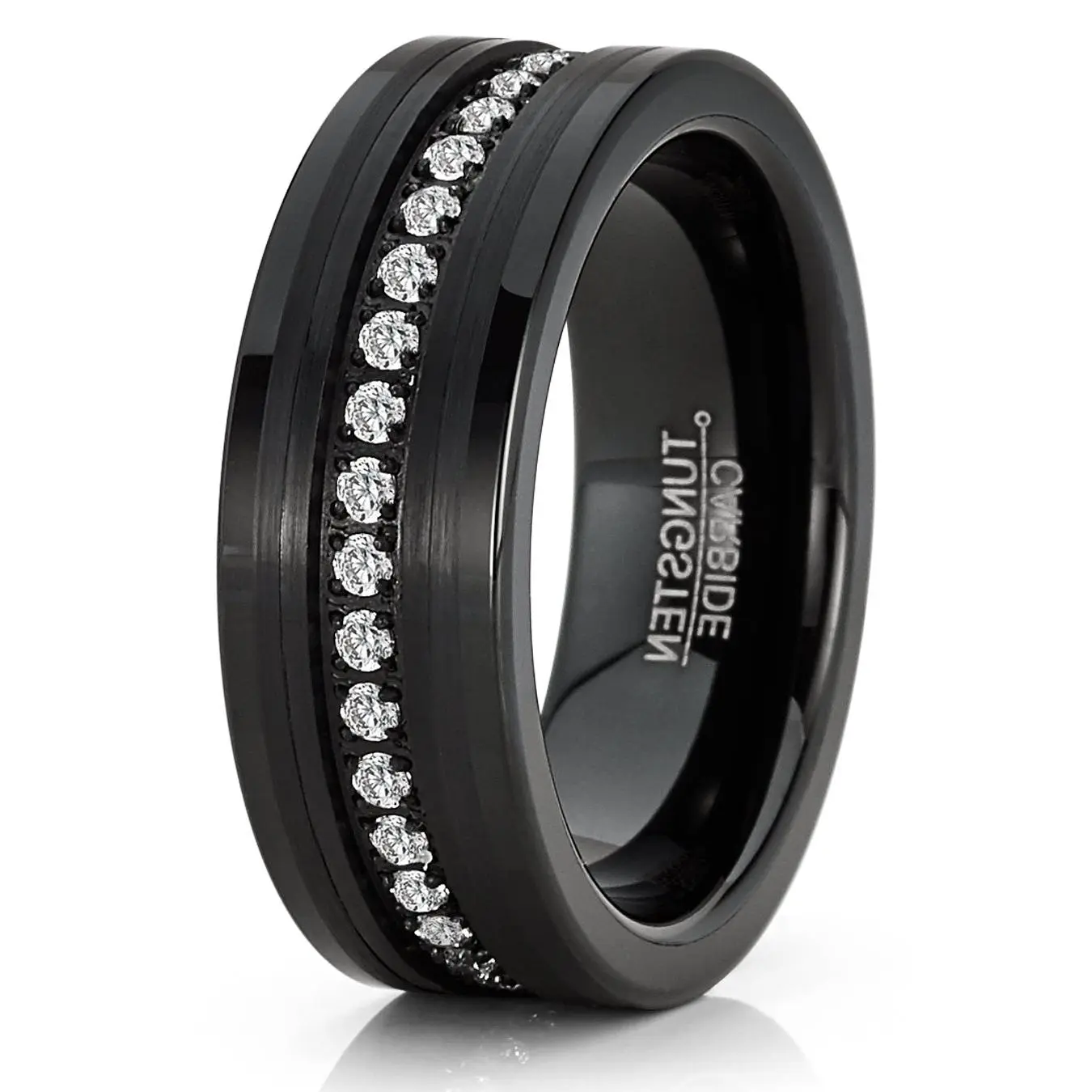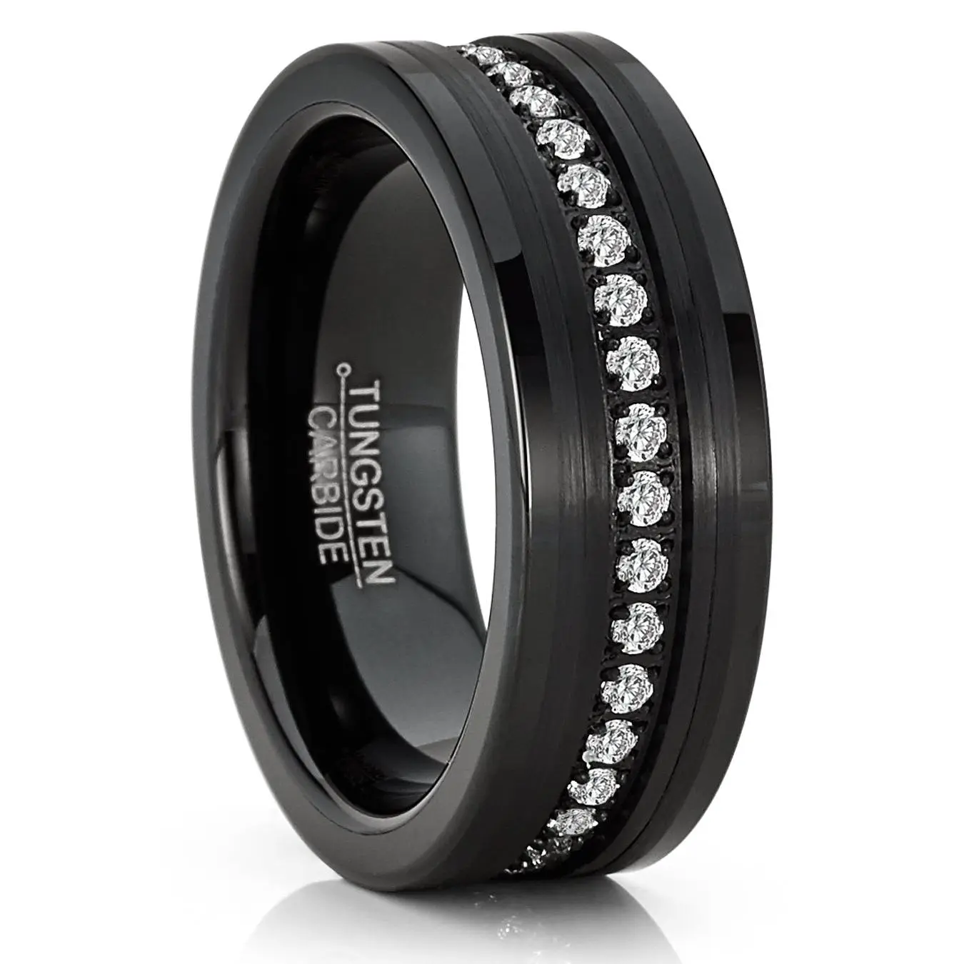 5. Mens Tungsten Ring Black Eternity Wedding Band Clear Cubic-Zirconia Comfort-fit 8MM
