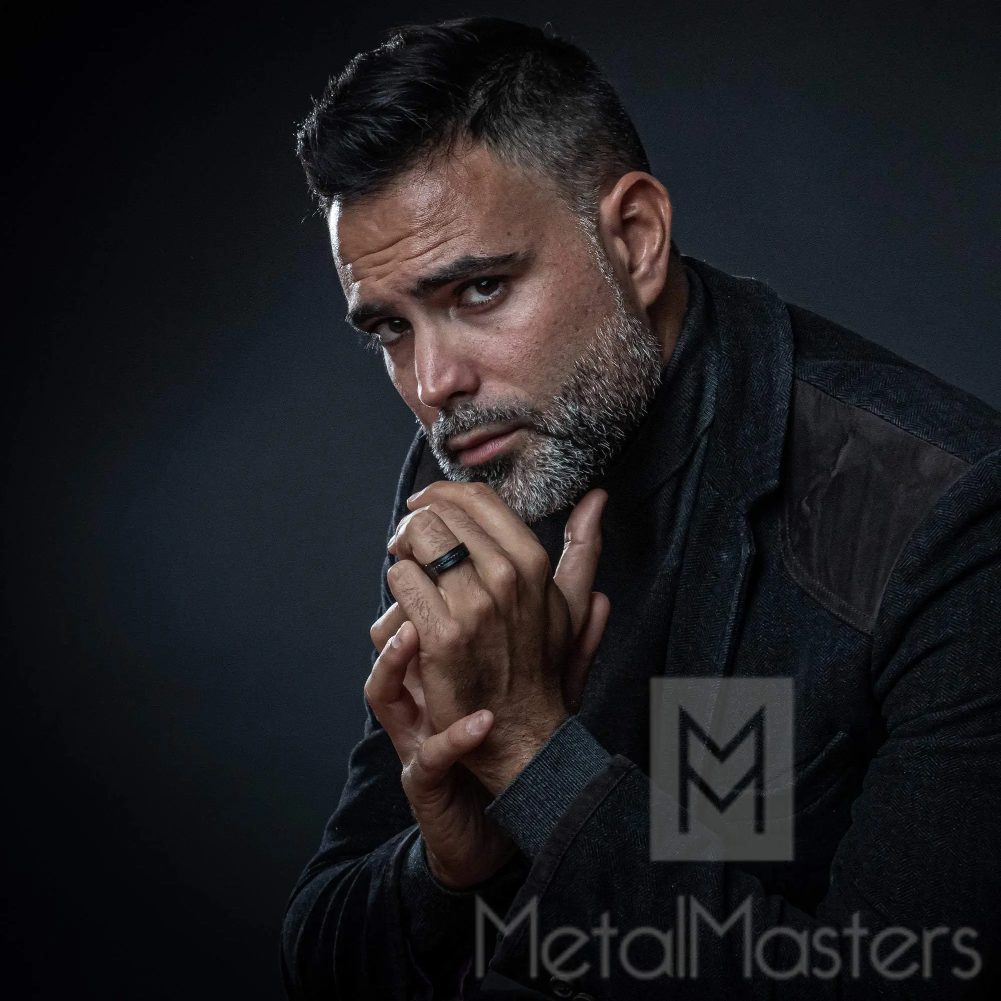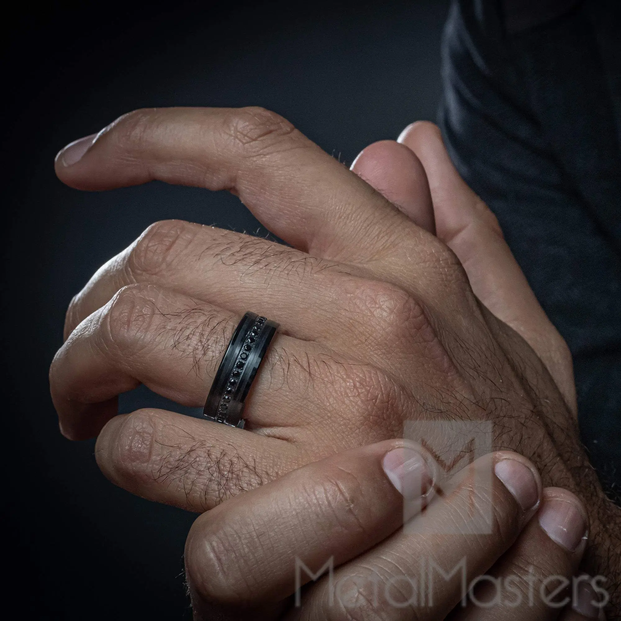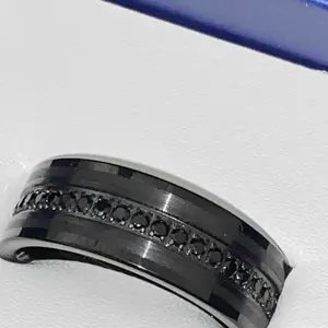 ·.5 Carats (tcw) black CZ (Cubic-Zirconia) stones in-laid around the ring.