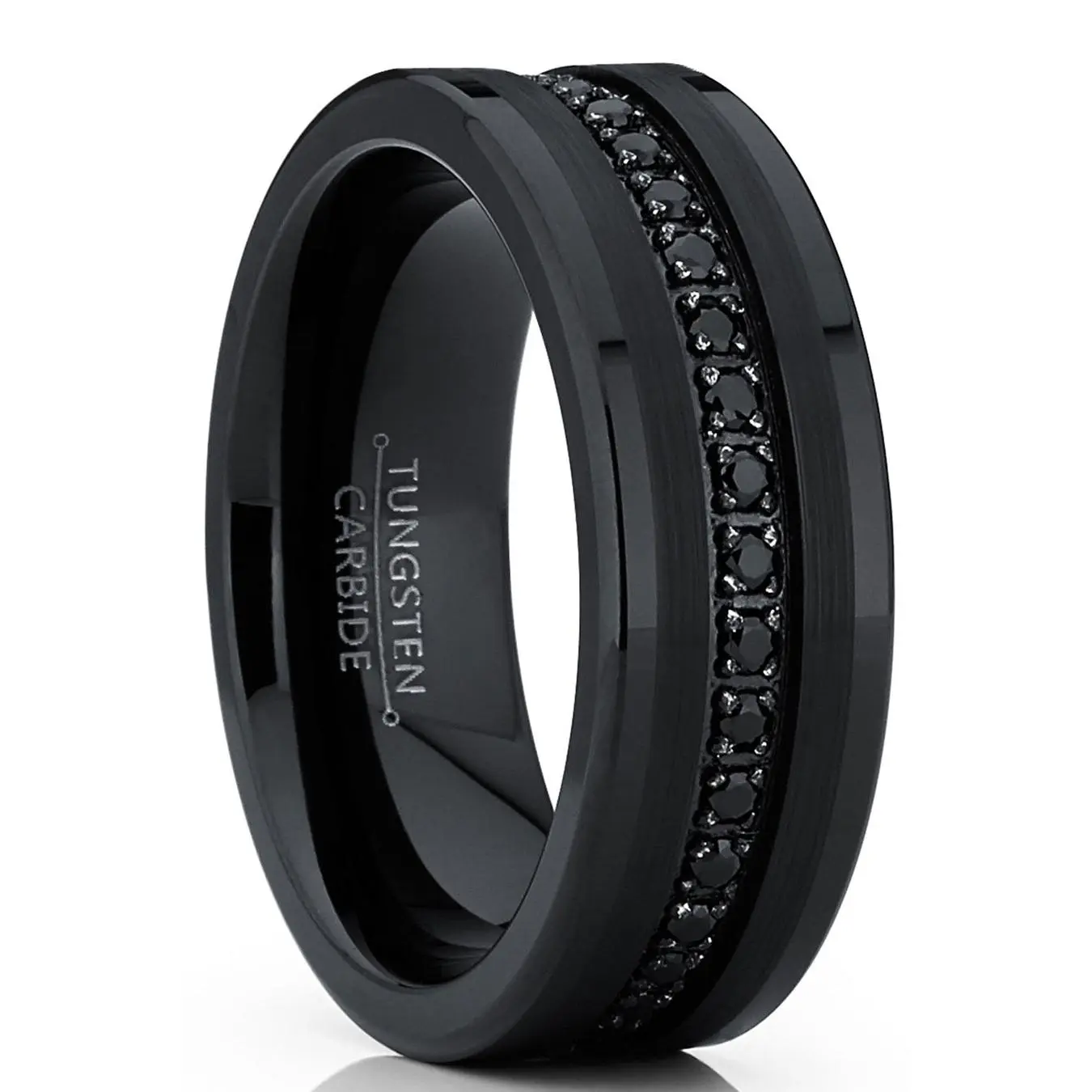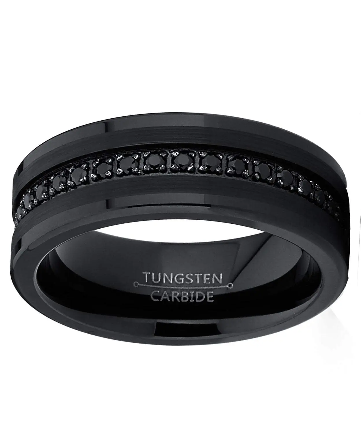 Say "I do" with this captivating high-polish and matte finished Tungsten Carbide men's wedding band in black. This very well crafted piece of jewelry is both masculine and sophisticated with prong-set eternity stones laid around the ring giving it a lavish "black diamond" look.