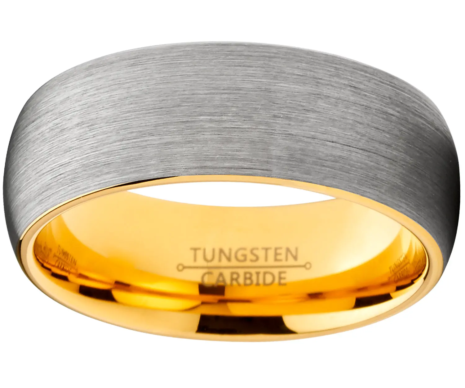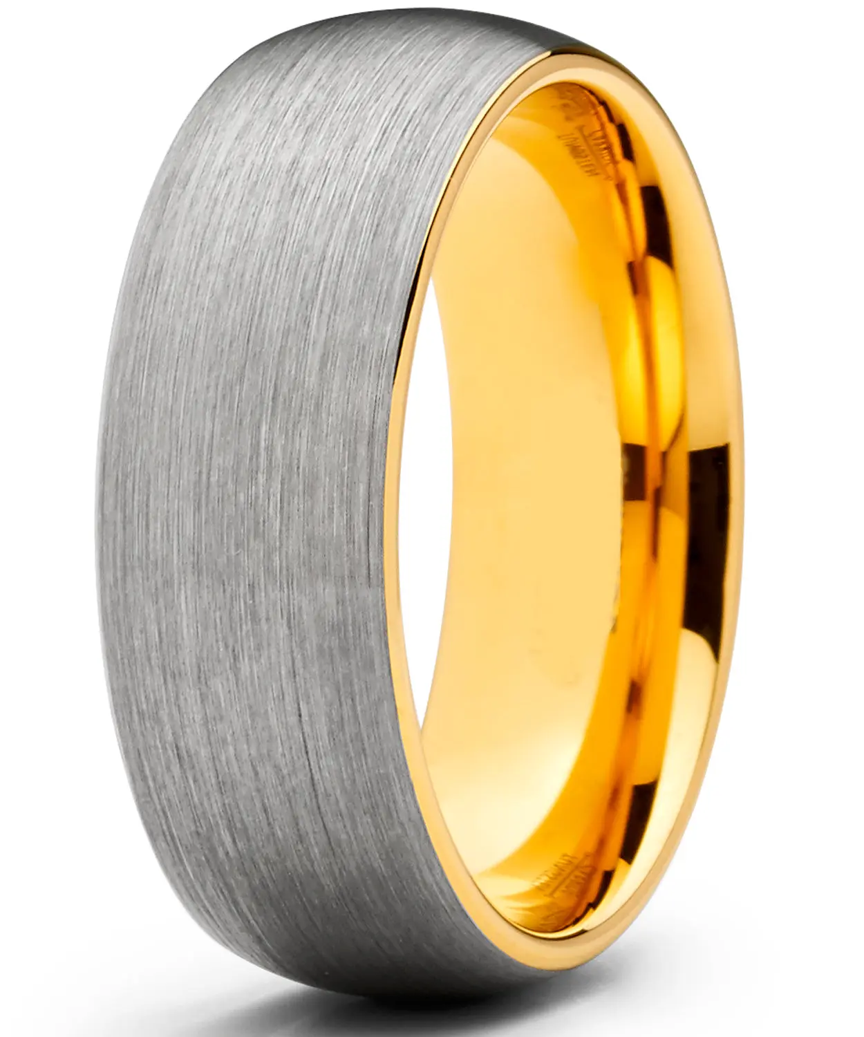 Celebrate your nuptials with this goldtone tungsten men's wedding band. This heavyweight metal ring is both masculine and sophisticated with a brushed silver finish that provides subtle elegance. The 8-millimeter band features a contoured inner surface for a more Comfortable fit with everyday use in mind. Rely on the sturdy tungsten metal for a durable piece of jewelry that stands up to the rigors of continuous wear for years to come. Tungsten is four times as sturdy and strong as titanium and features a scratch-resistant finish. This simple and modern ring is the ideal complement for a lifelong commitment wedding band has a grey and goldtone finish on the tungsten carbide metal. This durable ring features a brushed finish and domed, Comfort-fit design