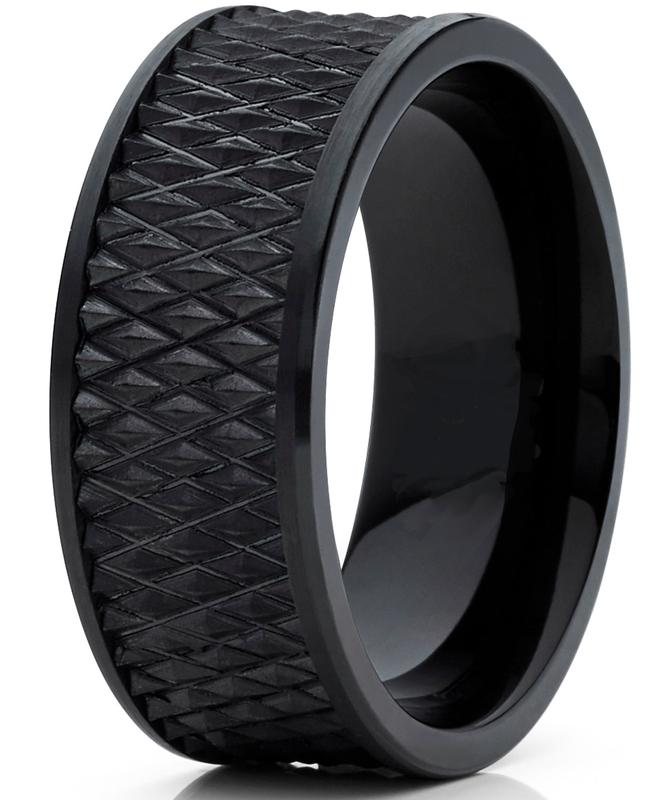 Celebrate your nuptials with this black plated tungsten men's wedding band. This heavyweight metal ring is both masculine and sophisticated with a brushed blue finish that provides subtle elegance. The 9-millimeter flat top band features a contoured inner surface for a more Comfortable fit with everyday use in mind. Rely on the sturdy tungsten metal for a durable piece of jewelry that stands up to the rigors of continuous wear for years to come. Tungsten is four times as sturdy and strong as titanium and features a scratch-resistant finish. This simple and modern ring is the ideal complement for a lifelong commitment wedding band has a diamond tread finish on the tungsten carbide metal. This durable ring features a brush finish and falt top, Comfort-fit design.