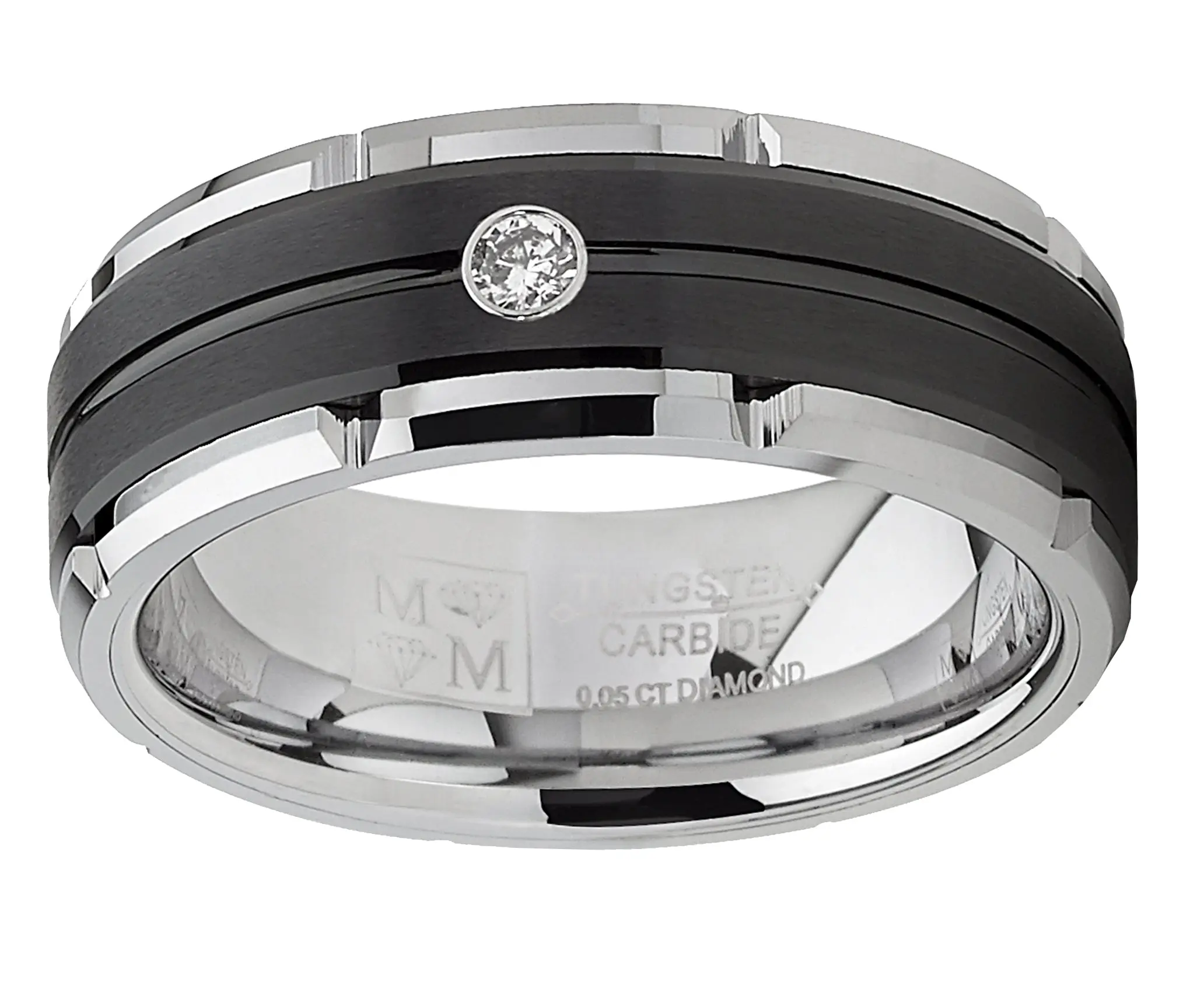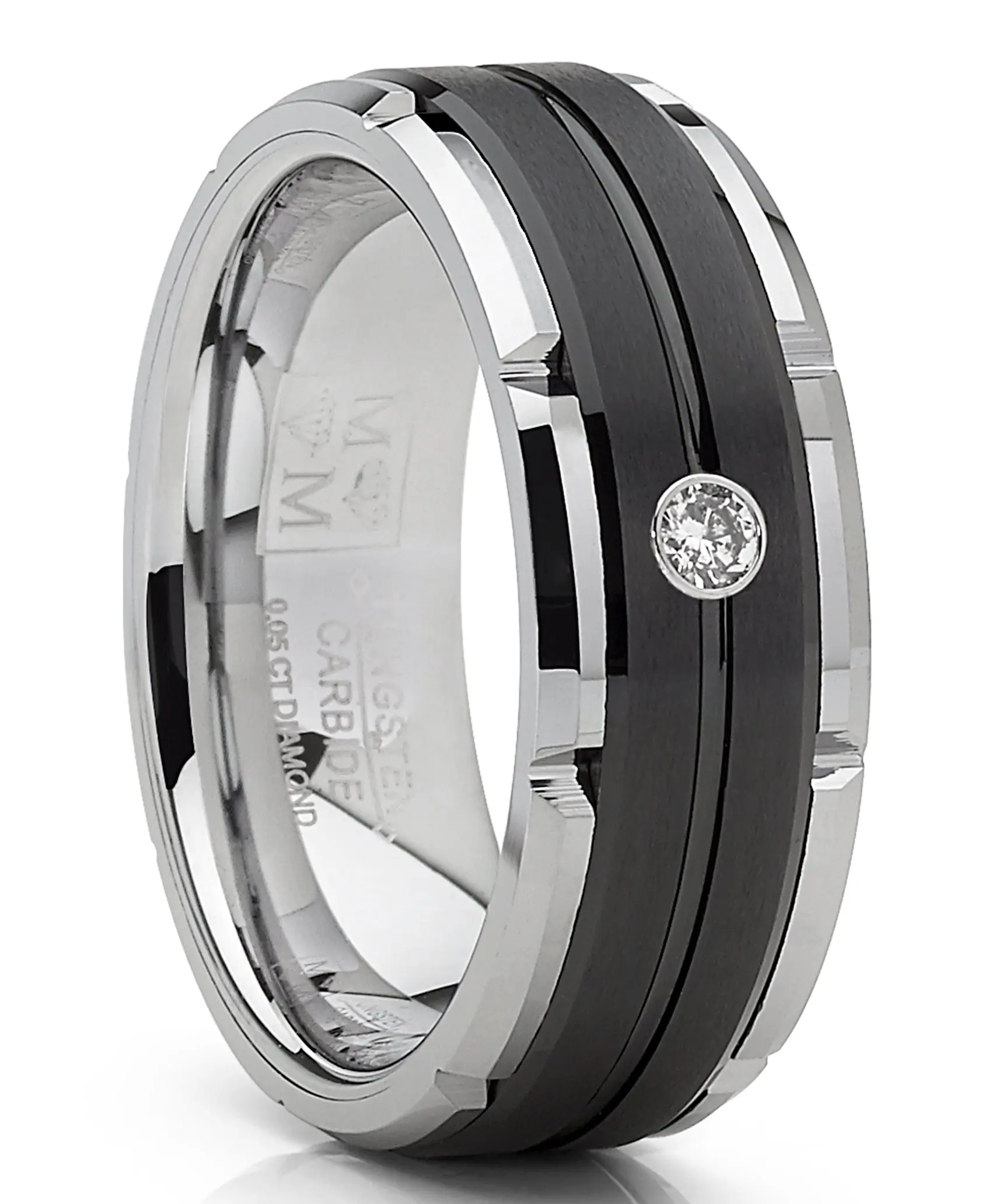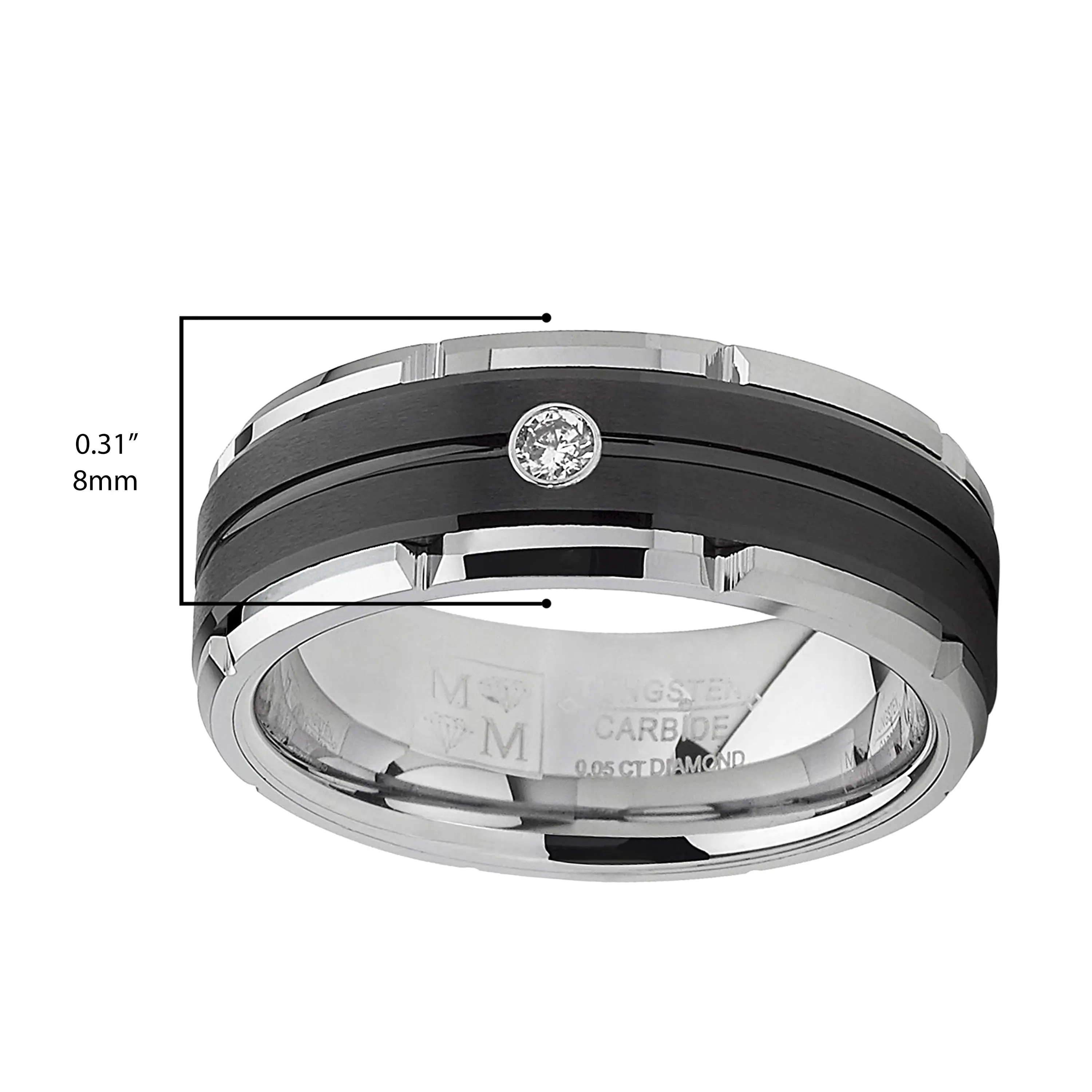 Modern and unique, this handsome ring has been expertly crafted from tungsten carbide to add bold style to your look. The band features a high polish shine on the beveled edges and a wide black center stripe with a brushed finish, with a recessed groove in the center that travels around the ring. In the middle of the two-tone wedding band sits a single round .05 carat white diamond. This ring measures 8mm or 1/3" wide, and it has a Comfort fit with a contoured inner surface for everyday wear. Whether you gift this ring or keep it for yourself, it's a classic design with a twist that's sure to please.