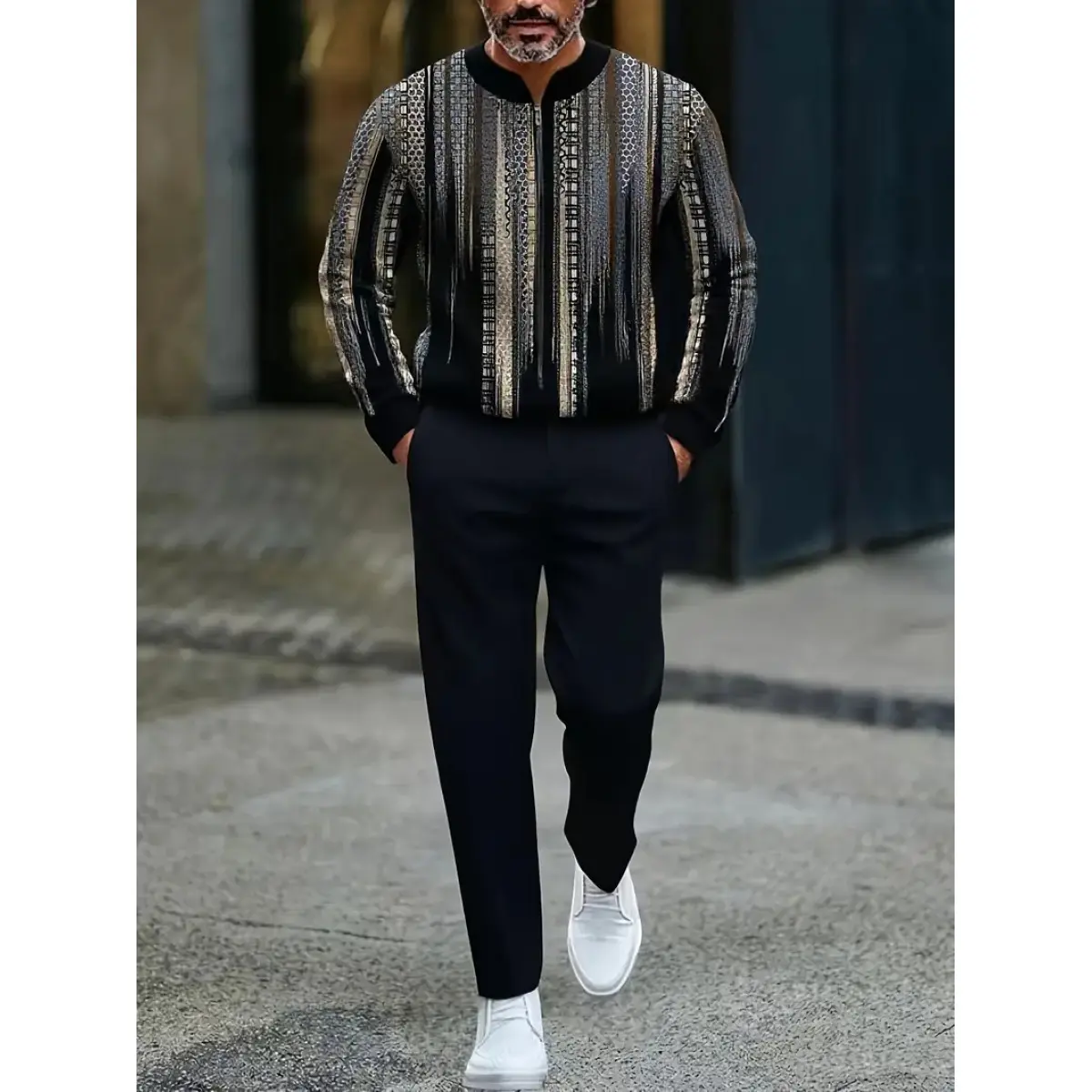 Fashionable men's two-piece new long sleeved shirt casual sports set, geometric pattern design versatile and comfortable fabric zipper long sleeved top and casual pants street style combination