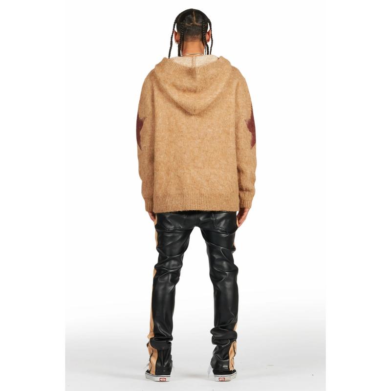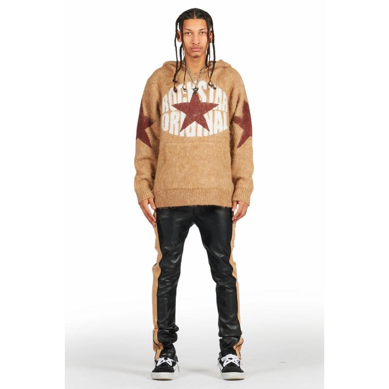 An urban skinny jean for men black. Designed with faux leather fabric and custom detailing for a dope denim streetwear style.