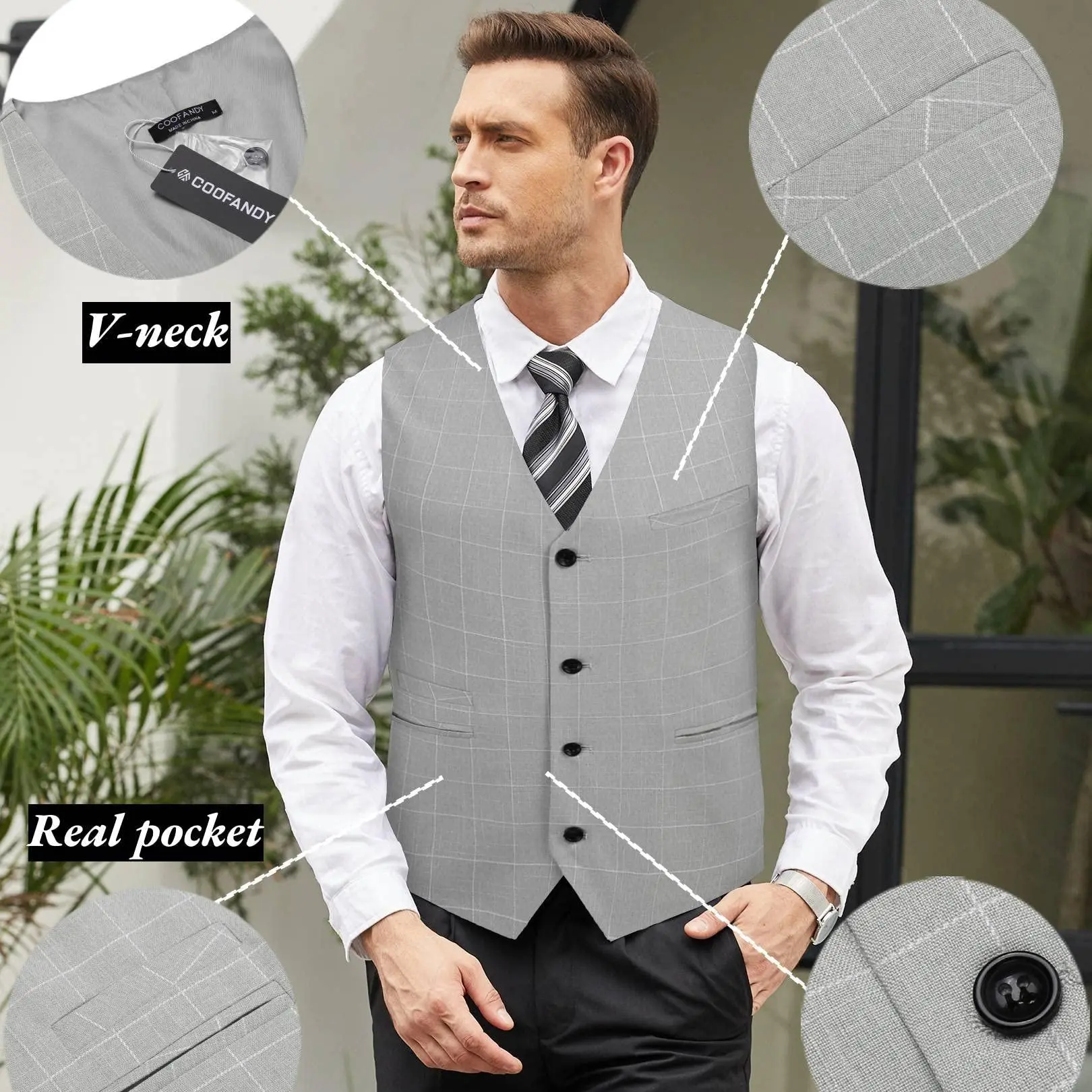 ·Business Modern Vest Design--- Leisure simply style suit vest beautifully cut, excellent craftmanship, designed with 2 front pockets,1 chest pocket, 4 button front closure, adjustable back strap offers you more accurate fit.