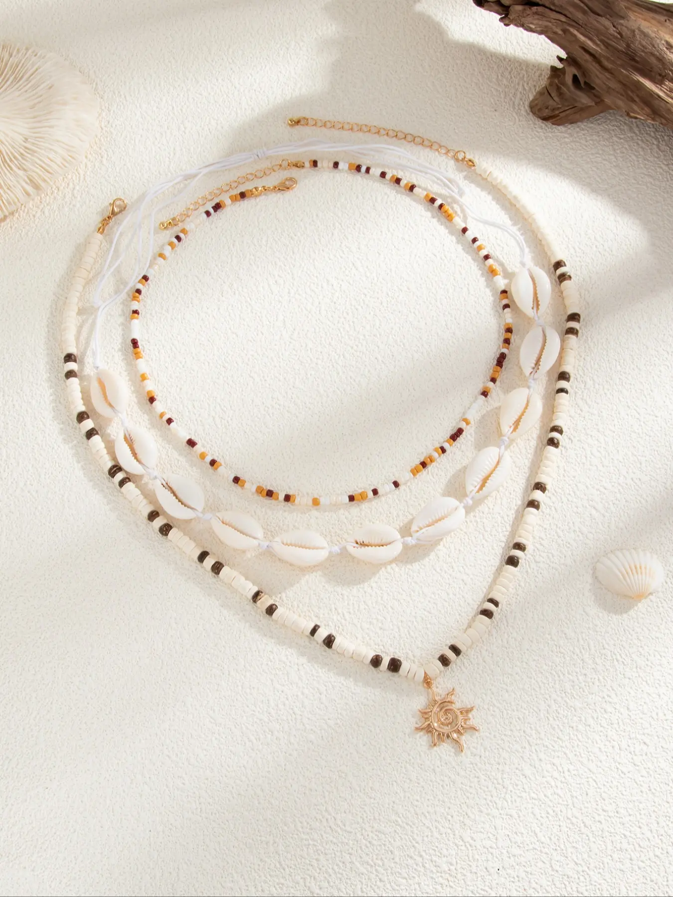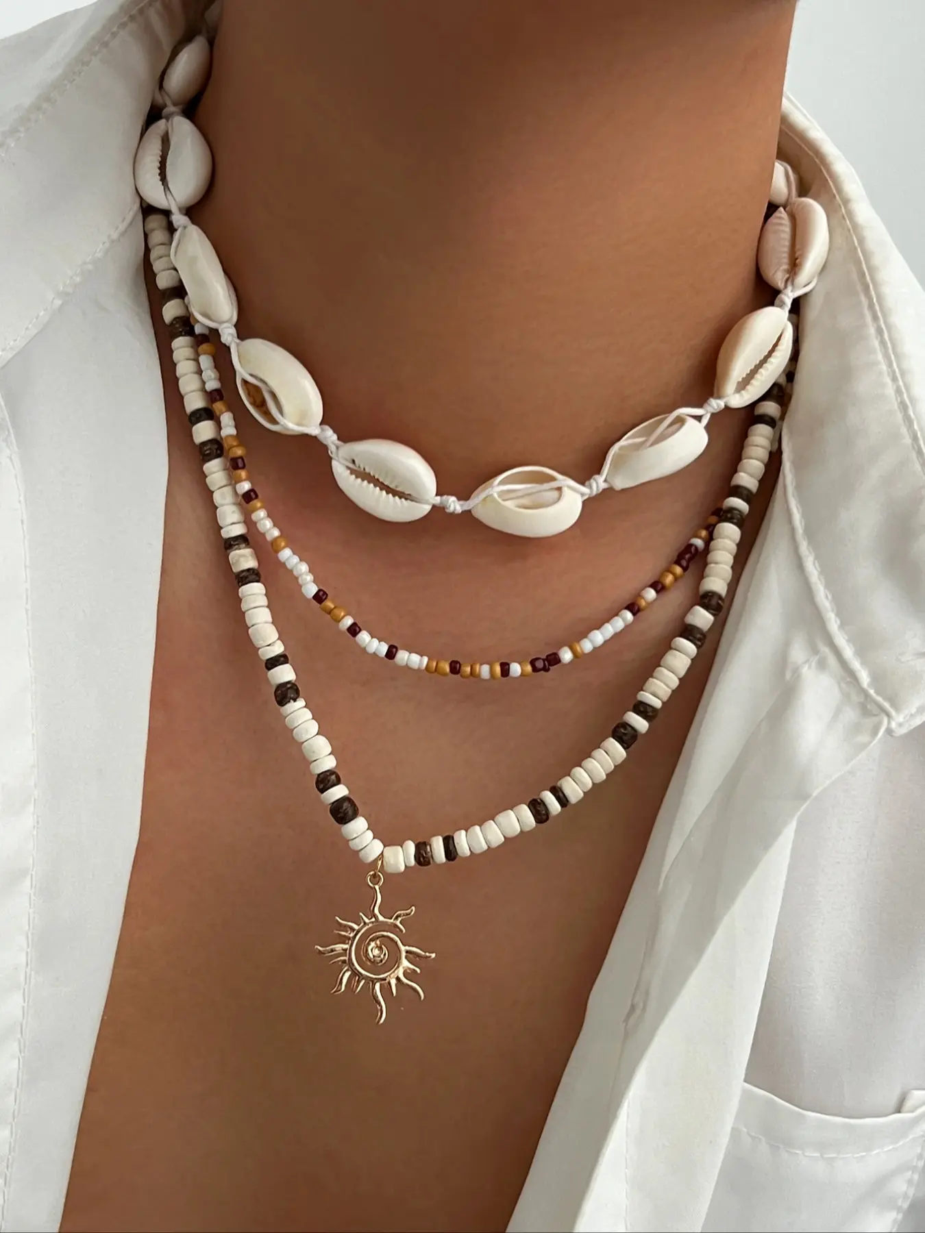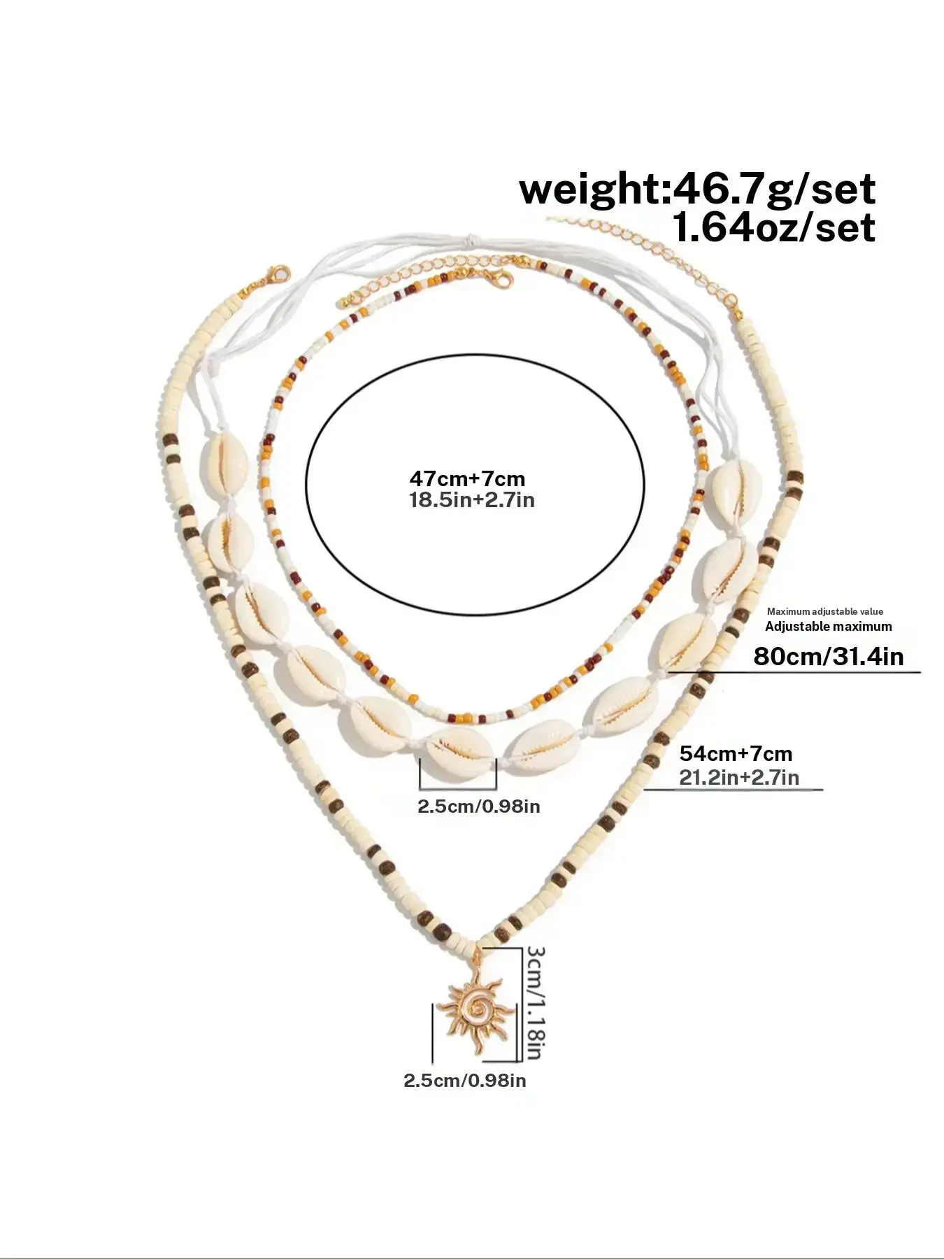 I Love how they lay together. I will be wearing these every day. I will take them off in my sleep ofcoarse so I don’t break them. But I’m glad I got these and don’t regret it not one bit. I love layered necklaces especially spiritual ones like these. Good material. And very good size. size changes