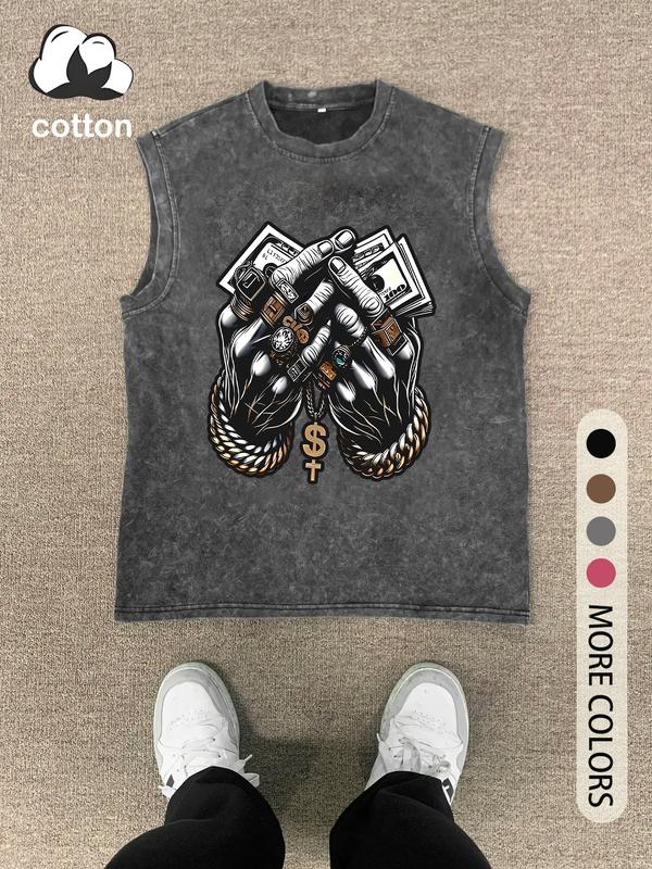 Men's Vintage Graphic Print Round Neck Tank Top, Regular Fit Casual Fashion Sleeveless Top for Summer, Men's Clothes for Daily Wear, Socks