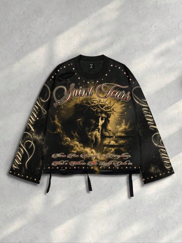 Men's Vintage Street Style Saint Print Long Sleeve Round Neck T-Shirt, Loose-Fitting Short Fit, Fall 2000s Fashion