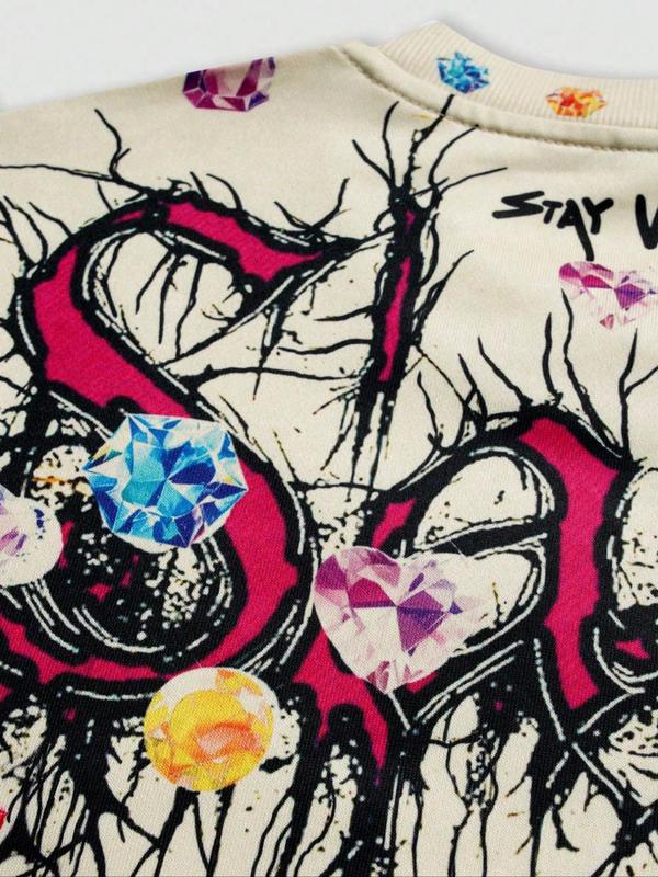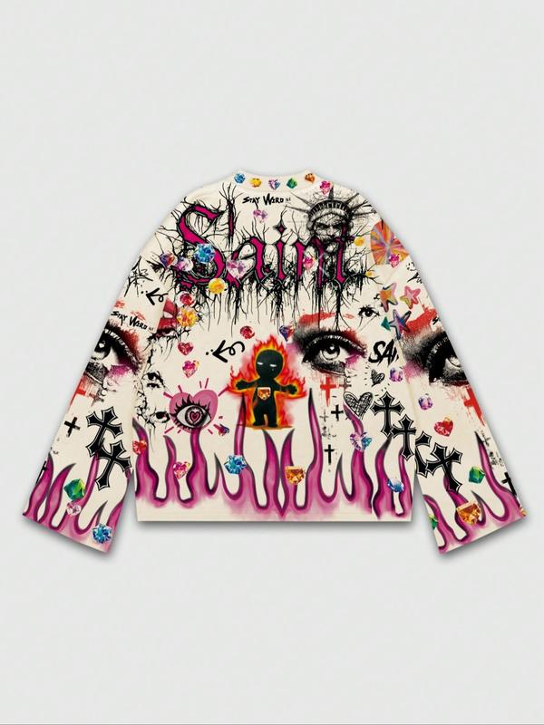Men's Vintage Street Style Saint Print Long Sleeve Round Neck T-Shirt, Loose-Fitting Short Top for Fall, 2000s Fashion