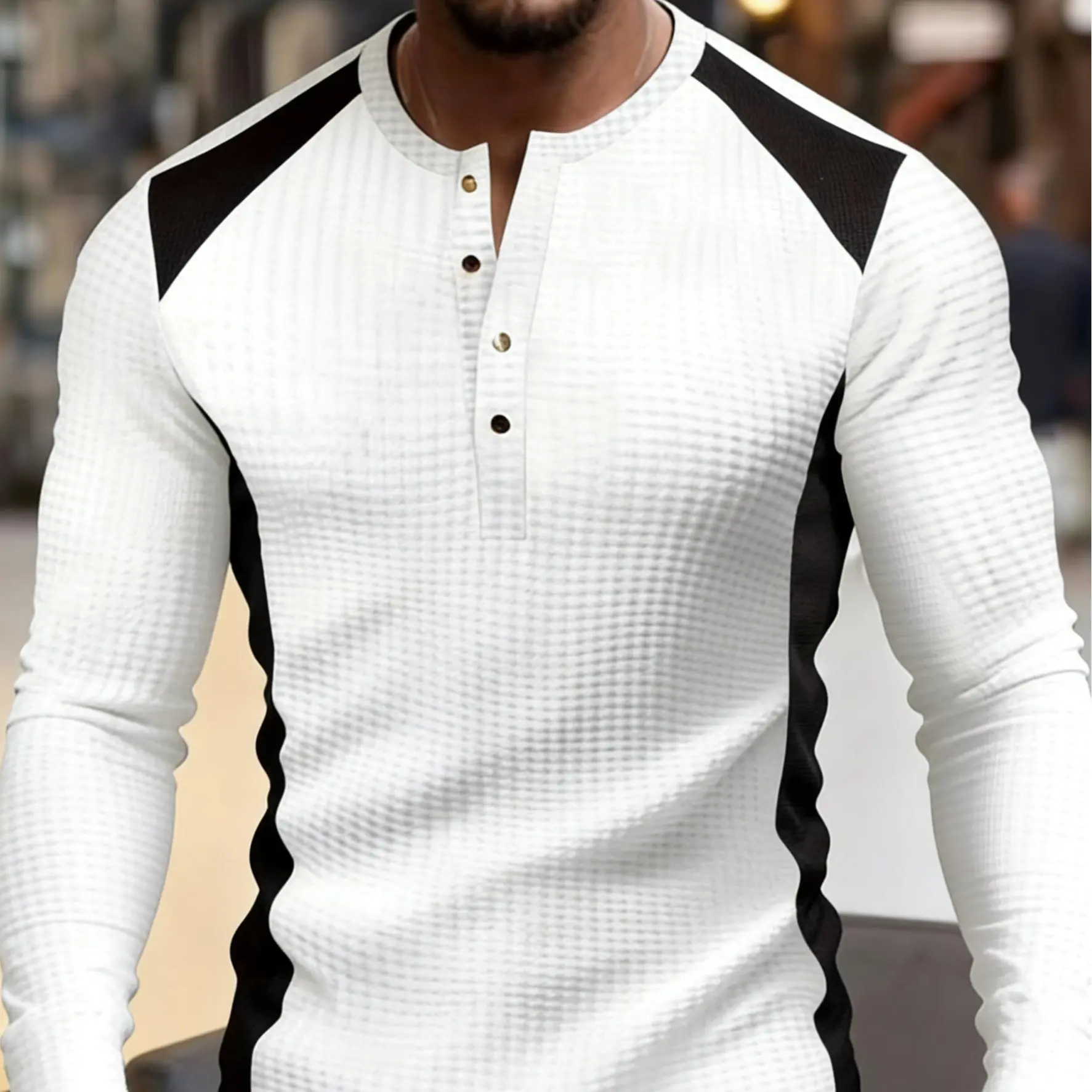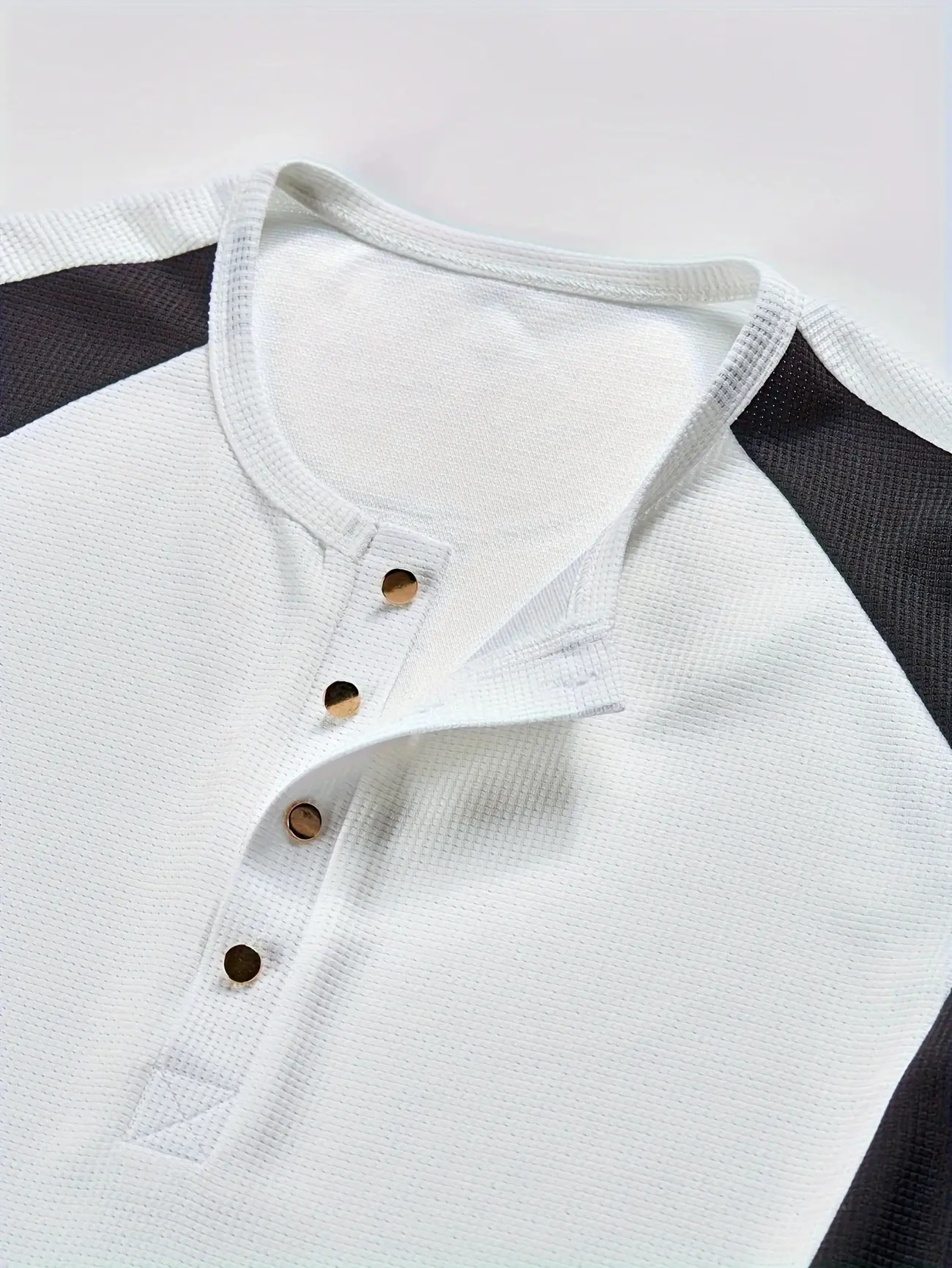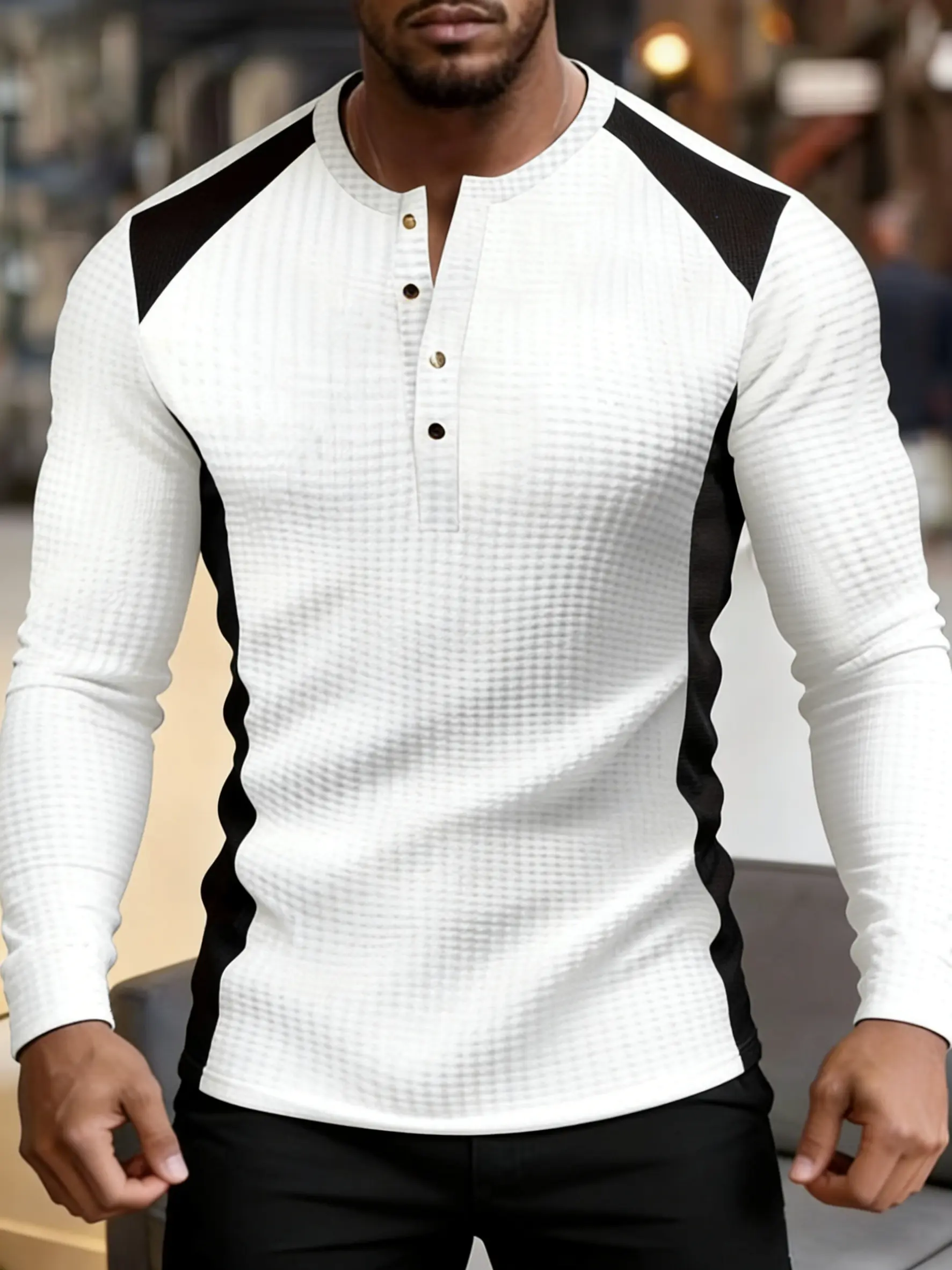 Men's Waffle Knit Henley Long Sleeve T-Shirt - Slim Fit Contrast Color Patchwork Design | Soft Breathable Fabric | Black & White Stylish Casual Top | Suitable for Daily/Date/Office | Autumn Winter Fashion Essential