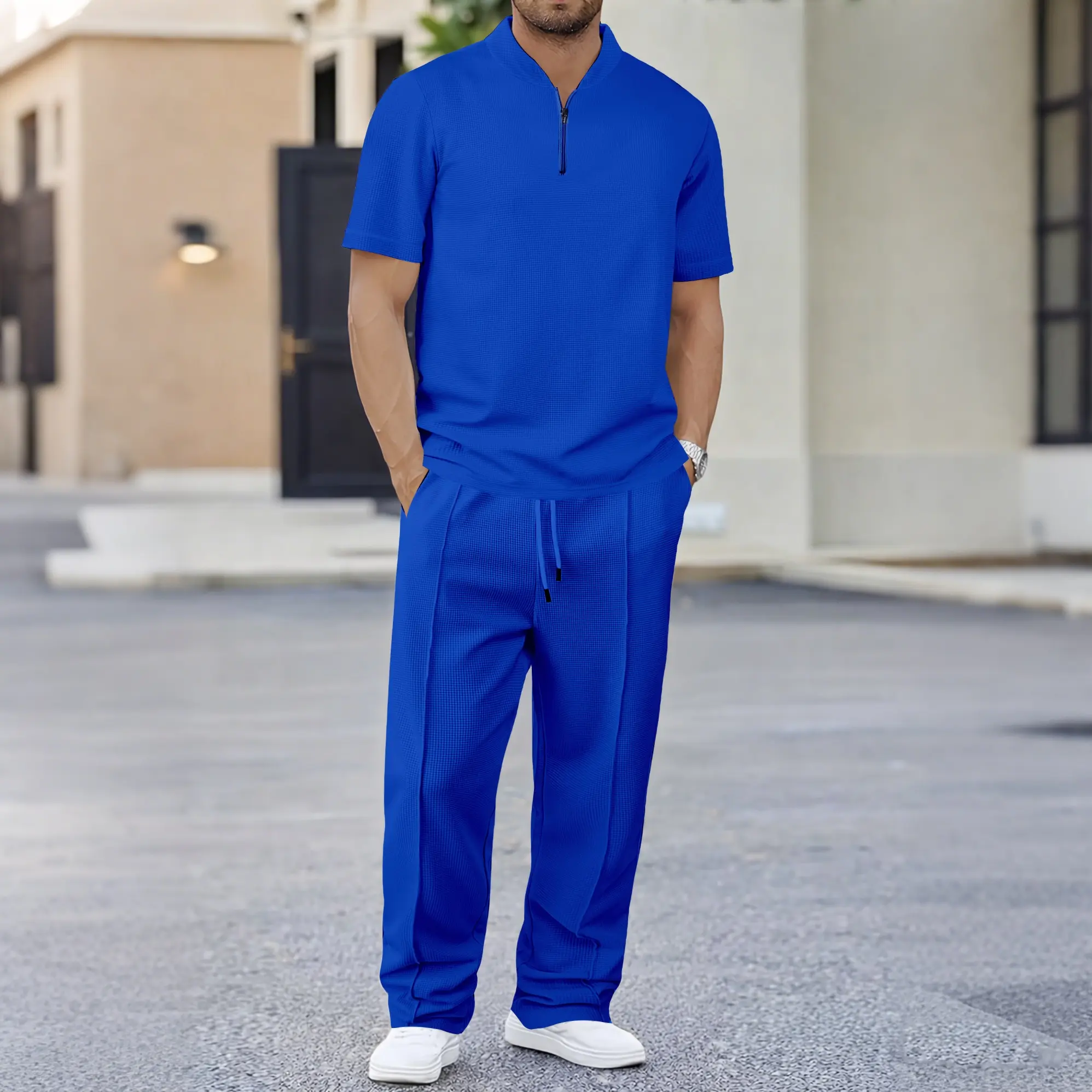 5. Men’s Print Zip Henley Collar Short Sleeve and Long Pants Two Piece Set Made with Waffle Knit Fabric Breathable Soft Texture Loose Fit for Casual Everyday Wear