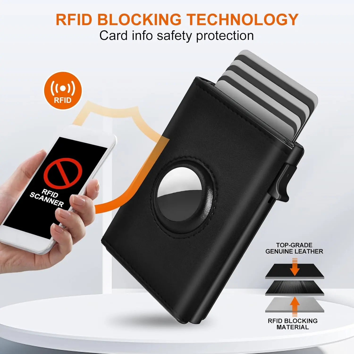Features a pop-up aluminum card case that stores up to 6 cards. With a simple press of the button, cards fan out smoothly for instant access.