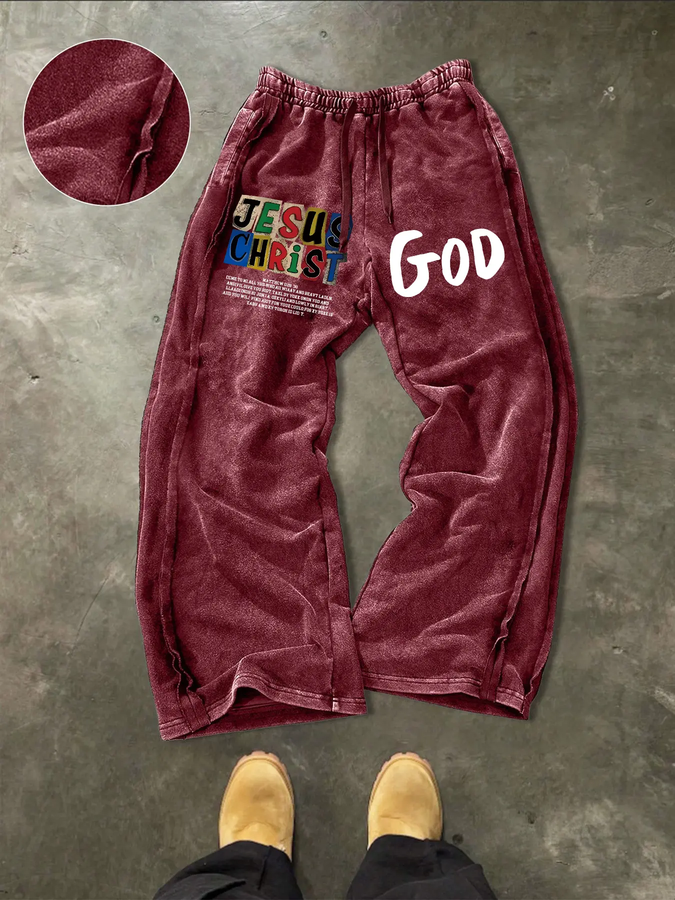 I mean the sweatpants themselves and the design is great and all but it’s really a bummer that the writing below “Jesus Christ” is alll just gibberish. There’s not even a Matthew 28:30 verse. The sweatpants are kinda of big but that’s probably just me not liking the whole crazy baggy look on clothes