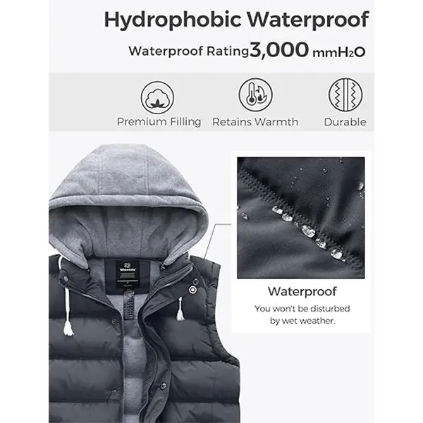 Ā·Outerwear That Keeps You Dry - Don't let a slight drizzle ruin your day out. The puffer vest for men has waterproof membrane that keeps your body warm and dry under light rain for about 2-3 hours.