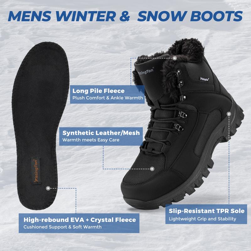 Fittington Men's Wolfwalk Winter Boots V3 Black Waterproof Insulated Mid Calf Snow Boots with Slip-Resistant Outsole & Plush Fur Lining for All-Day Comfort