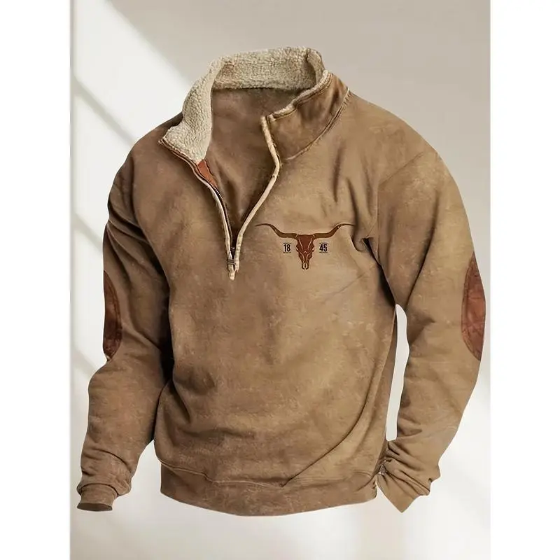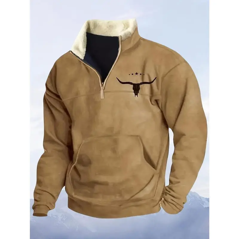 5. 2025 Men'S Western Fleece Jacket Cowboy Bull Head Print Pullover 1/4 Zip Stand Collar Long Sleeve Sweatshirts Menswear Coats