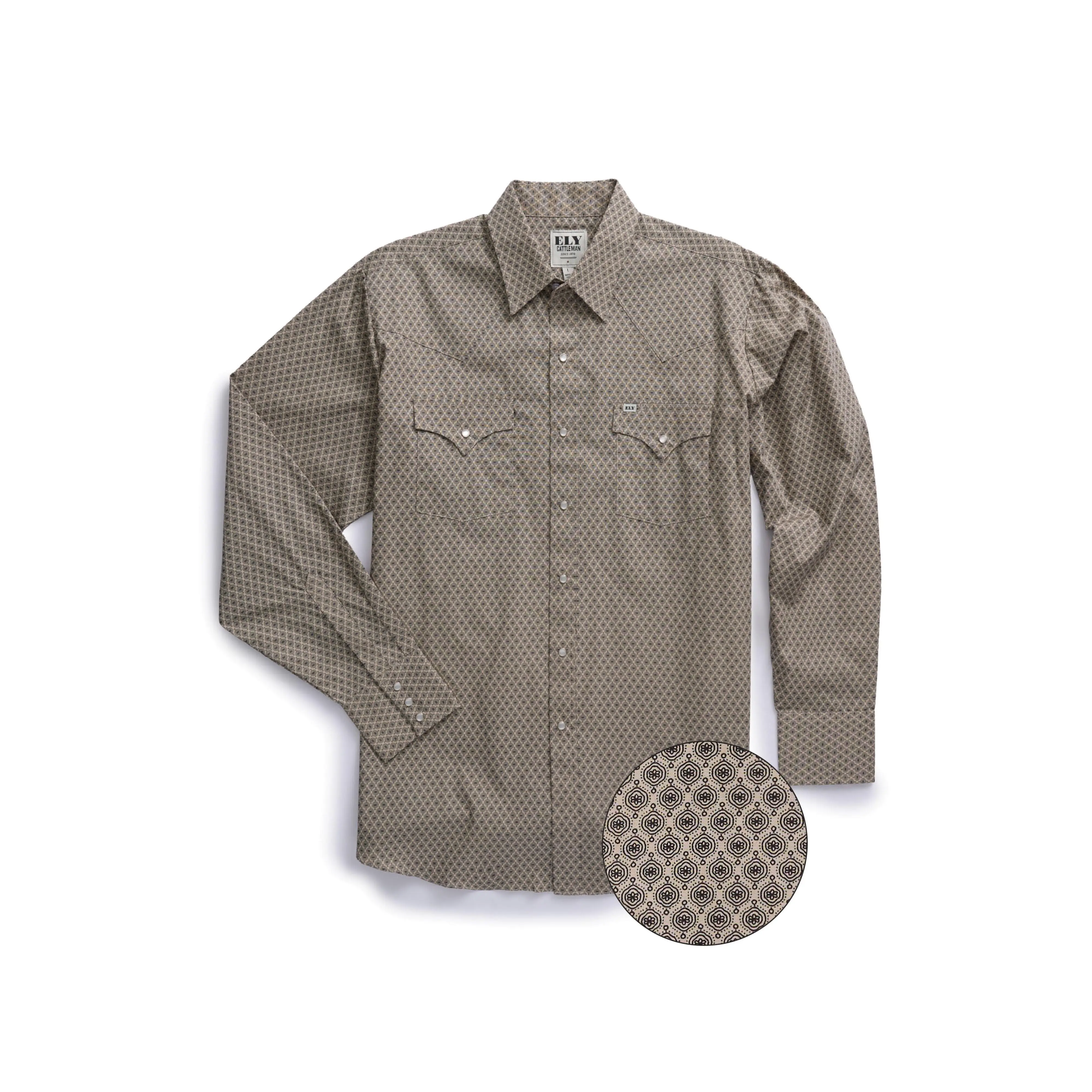 @Ely Cattleman Western Cowboy Men’s Pearl Snap Shirt in Khaki Medallion Print #westernwear #westernfashion #westernstyle #cowboys #pearlsnap
