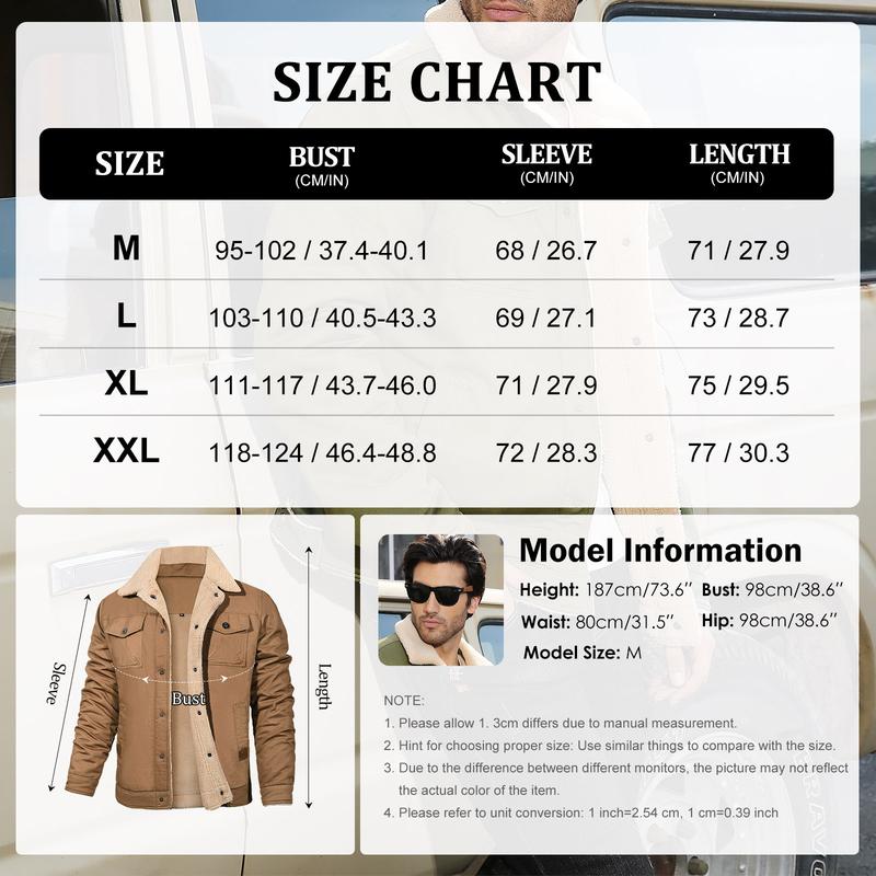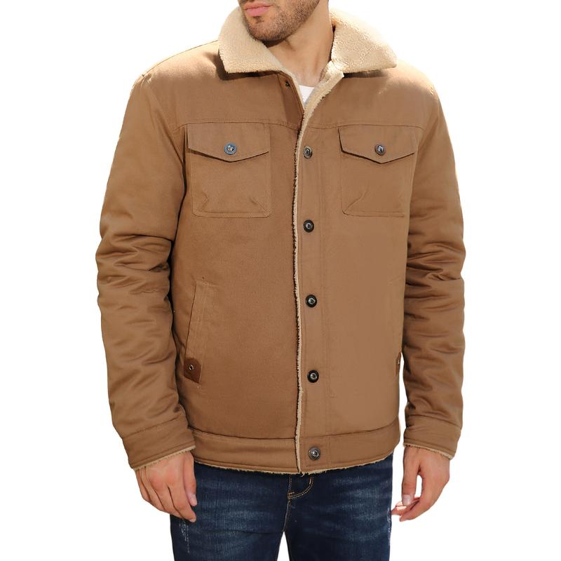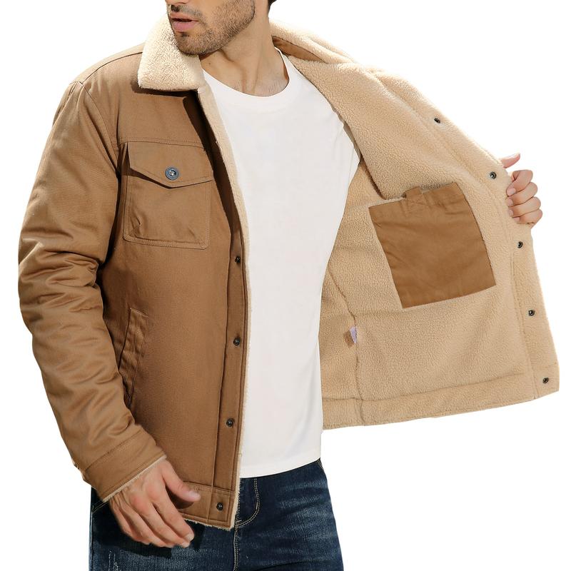 Stay warm in style with this Men's Winter Jacket. Featuring a Sherpa-lined interior, this jacket offers unmatched warmth. The Trucker Coat design includes multiple pockets for convenience. Perfect for casual wear, it comes with a collared neckline. Made from cotton fleece, this long-sleeve jacket is ideal for fall. Available in Khaki and Beige, it's perfect for outdoor activities. 🌲