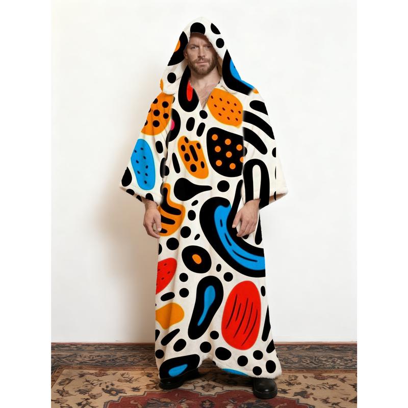 Men's Winter Hooded Kaftan Robe - Colorful Art Print Bohemian Long Sleeve Loungewear, Fleece Lined Thermal House Coat with Pockets, Soft Indoor Outdoor Robe for Artists & Creative Spirits