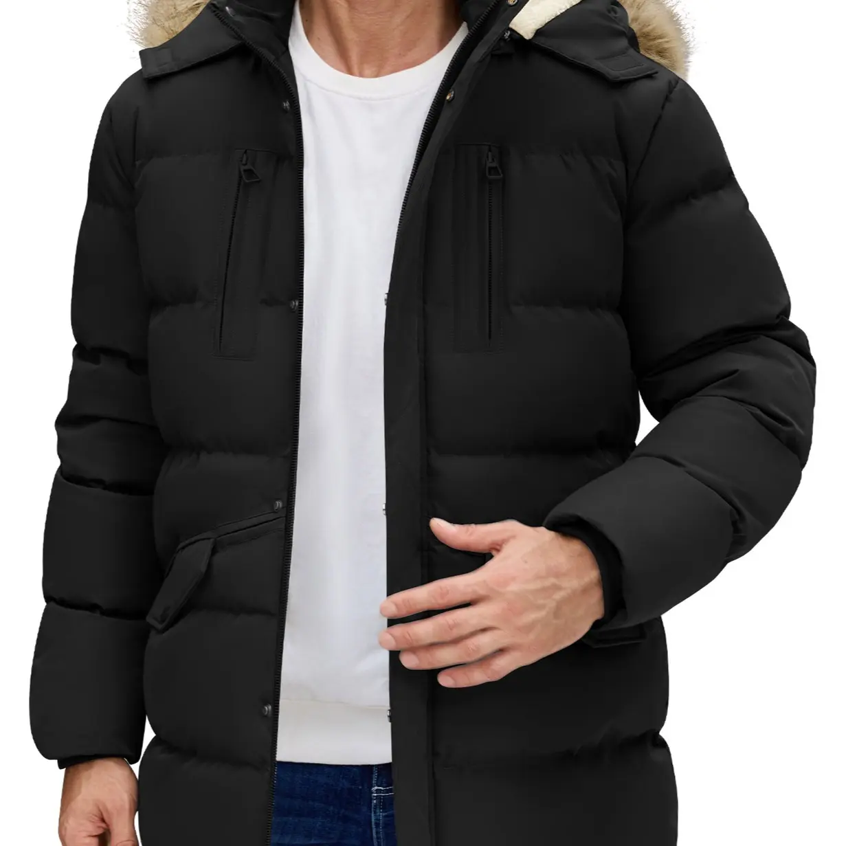 ·【Winter Warm Men's Coat】: This coat features a mid-length cut design, with the puffy jacket length extending to cover the thigh area. This length design provides better protection for the core body area and thighs against the cold, making it particularly suitable for wearing in cold winters or regions with lower temperatures. The overall fleece jacket construction is on the thicker side.