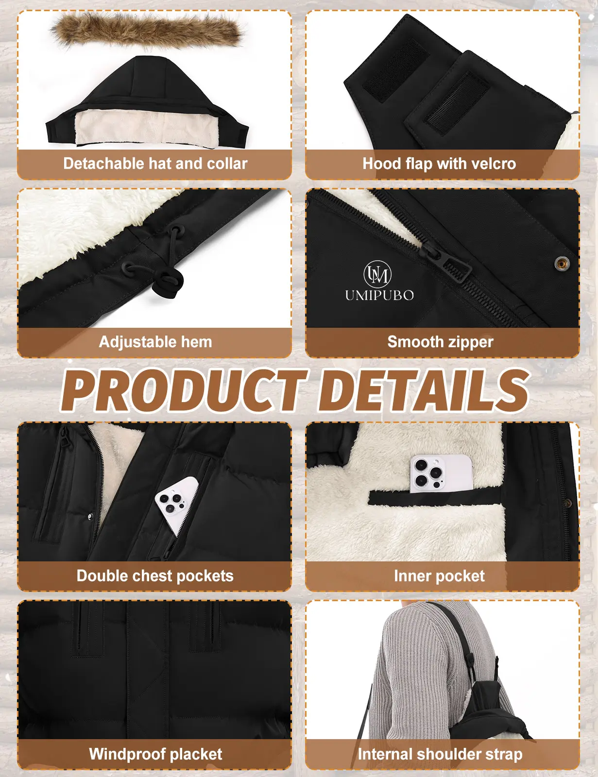 ·【Removable Hat and Fur Collar】: The hood and collar of this men's thickened coat are detachable with zippers. The inside of the hood is white, and the fur is brownish-yellow, soft and smooth to the touch. There are two hidden snaps on each side of the hood to secure it in place, effectively blocking cold air from entering through the neck and providing extra warmth and protection for the head and neck.