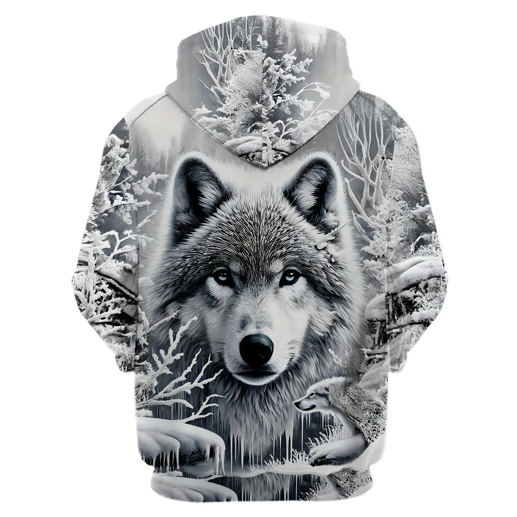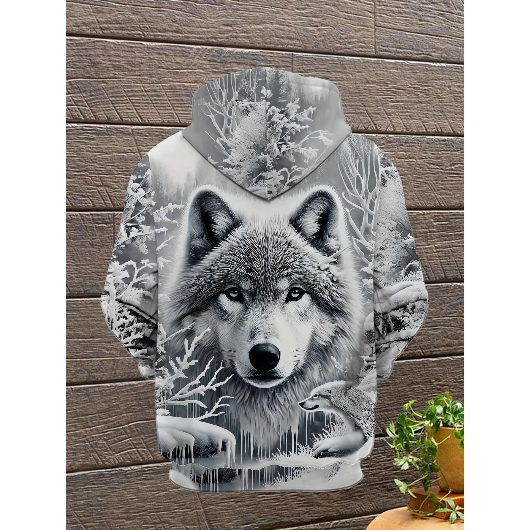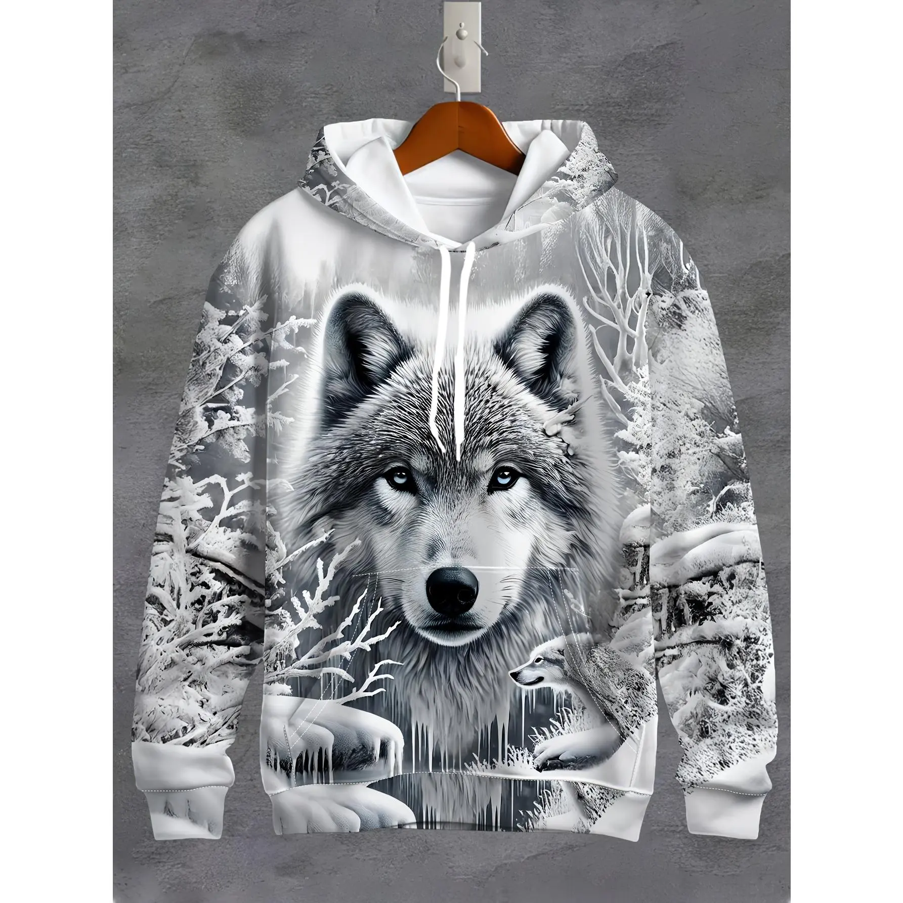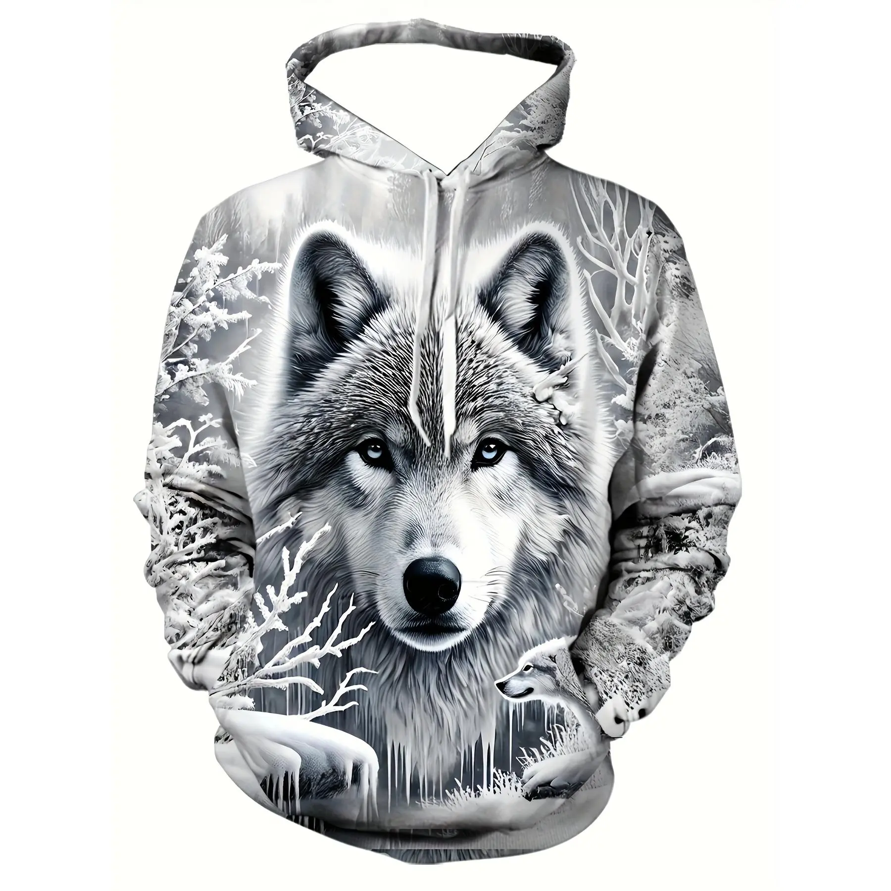 Men's Wolf Print Hoodie - Casual Polyester Knitted Top, Autumn/Winter Regular Edition Animal Pattern Hoodie