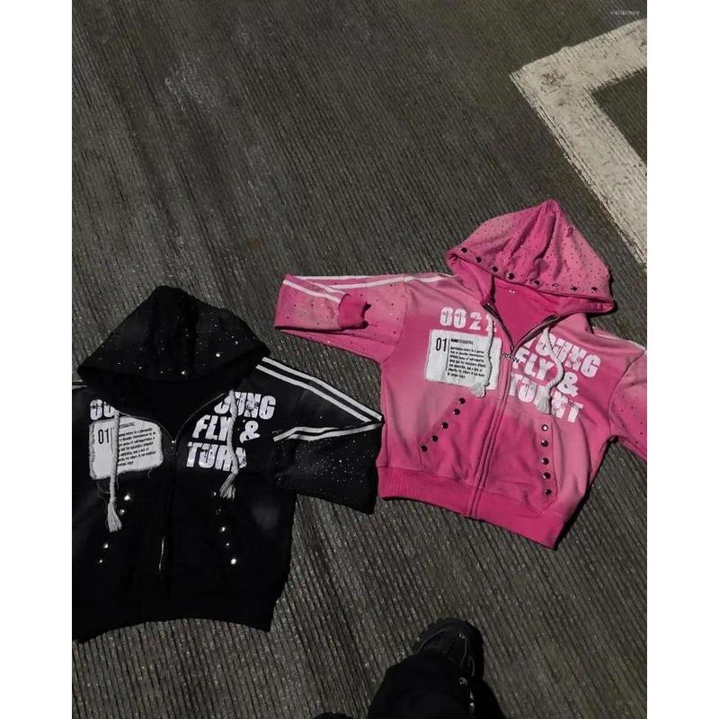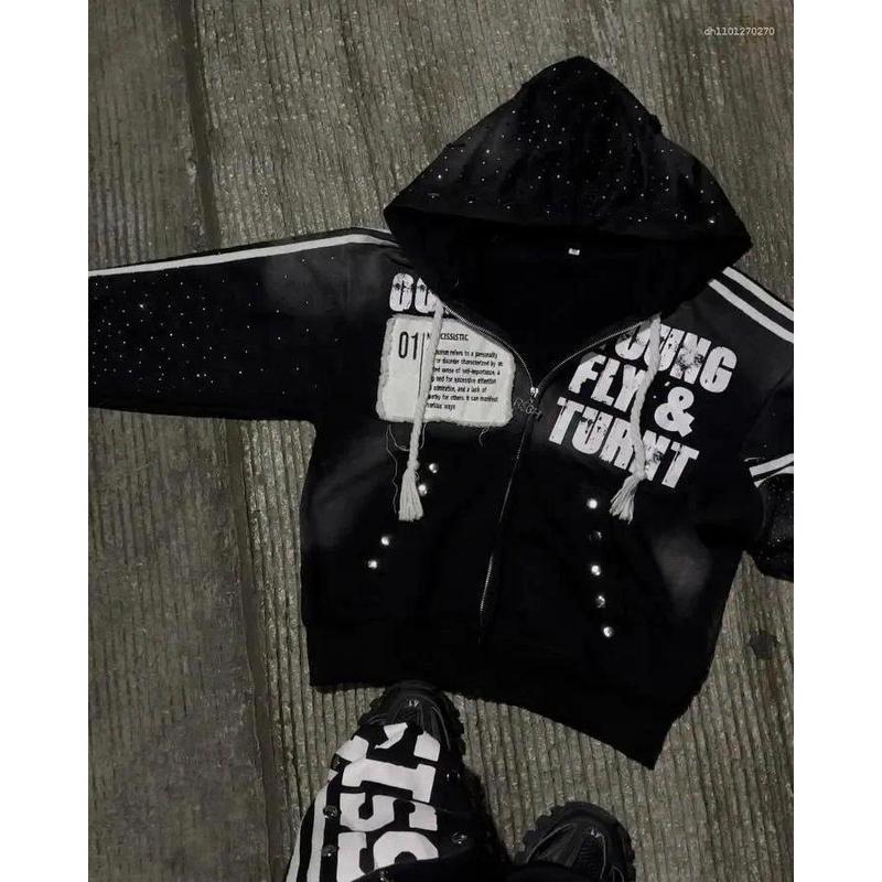 Men's Hoodies America Vintage Sequins Rhinestone Embroidery Zipper Hoodie Men Women Punk Gothic Stripe Patchwork Trendy Sweatshirt