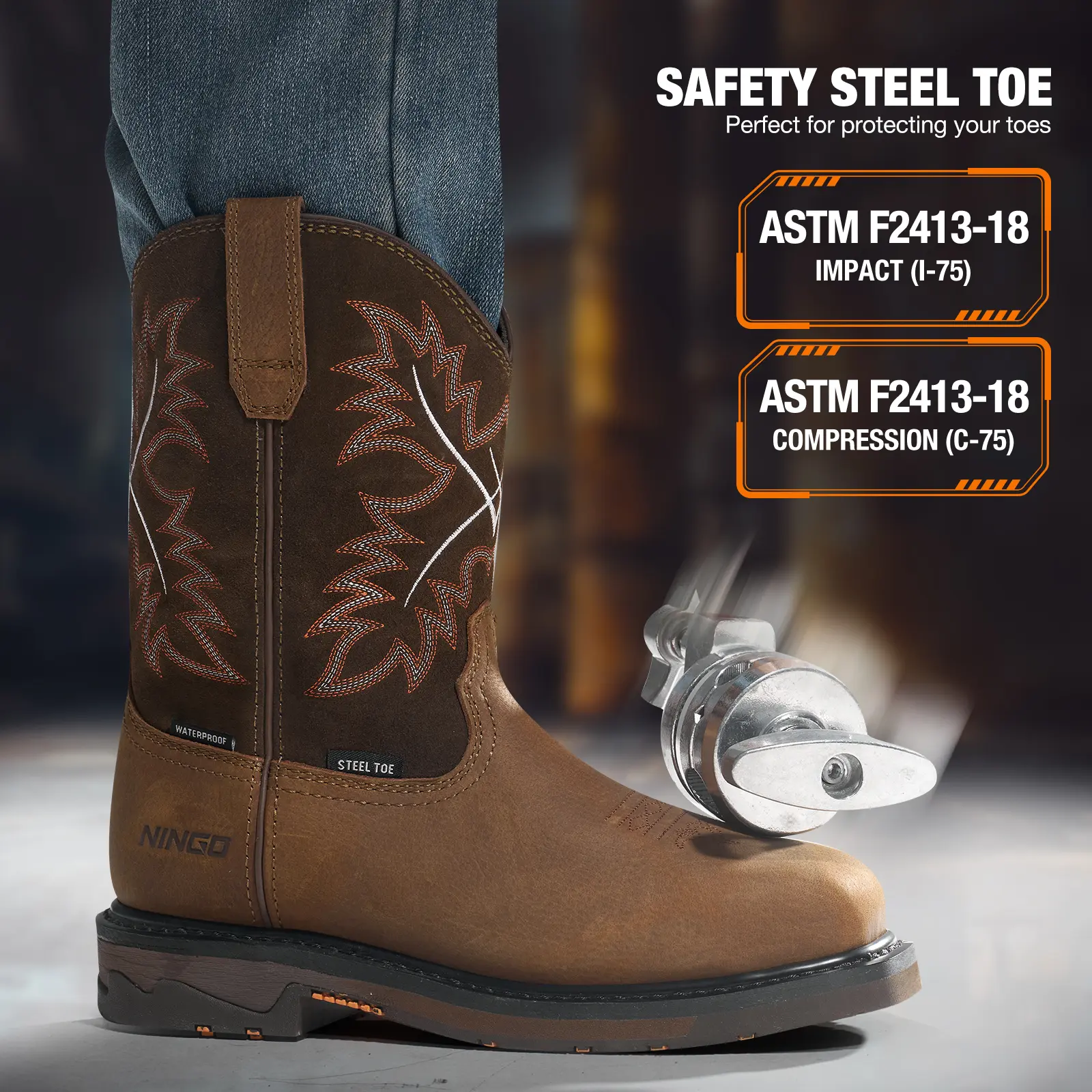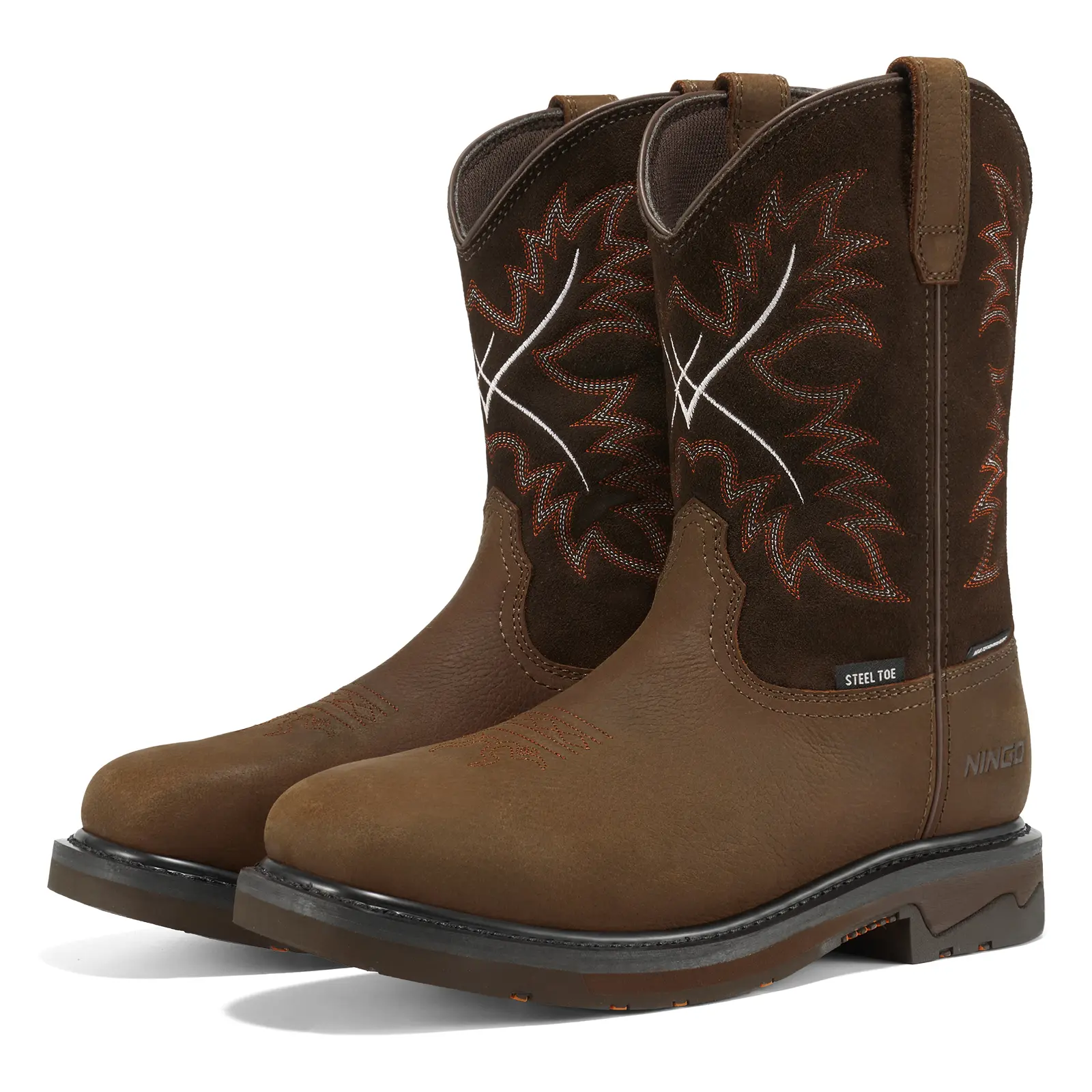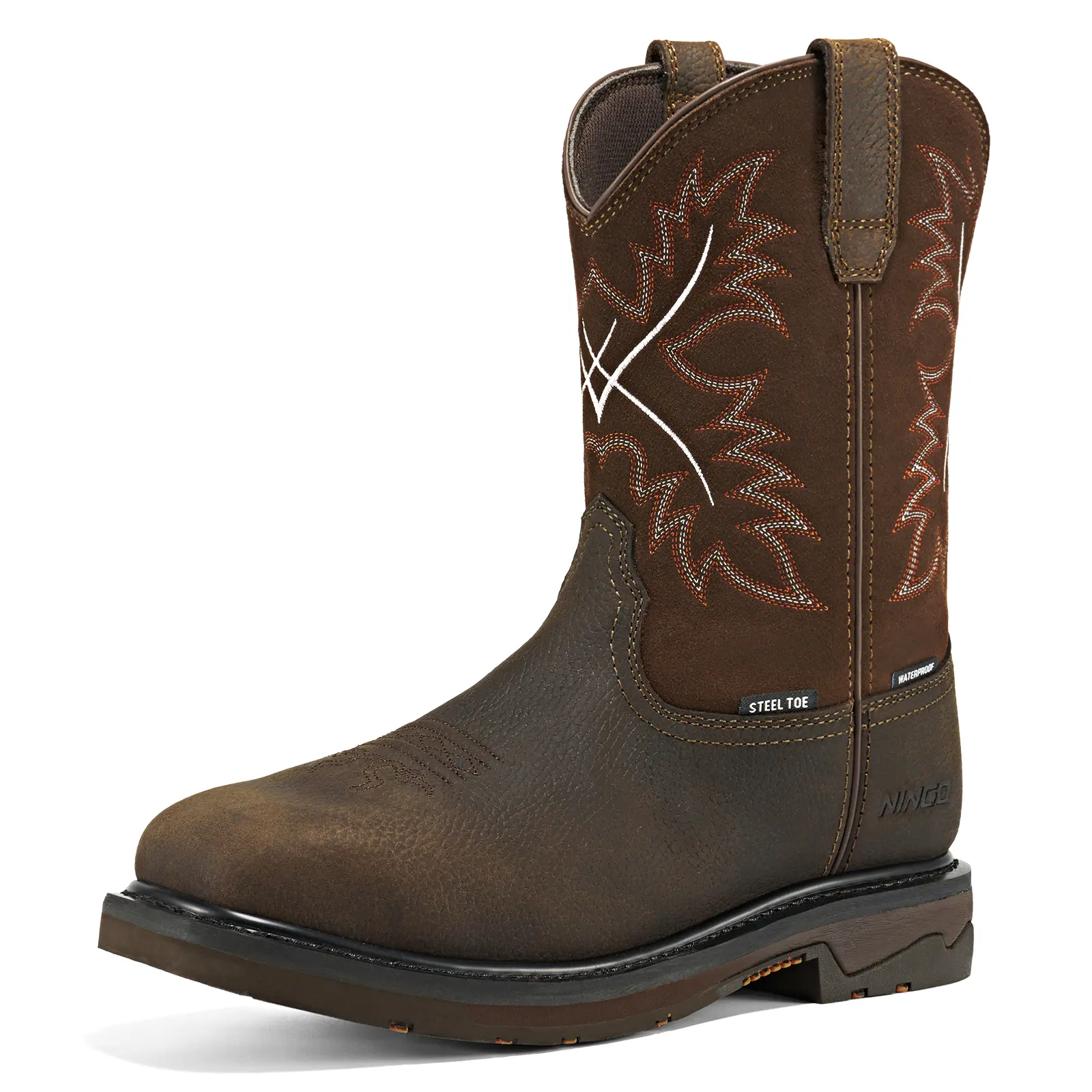Western Styling Work Boots- Exceptional Stability: NINGO Men's Western-inspired safety work boots offer superior side-to-side stability and shock absorption.- Superior Cushioning: Engineered for maximum support and durability, these boots provide all-day comfort.- Waterproof Performance: Rugged and reliable waterproof performance, ideal for harsh outdoor work environments and oil and gas exploration.