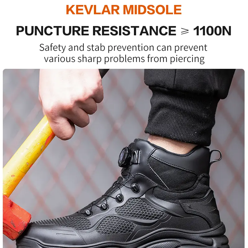 Puncture-proof and smash-proof: Our work shoes take workplace safety to a new level with puncture-proof Kevlar midsoles and smash-proof steel toes. These features can effectively defend against sharp objects, heavy blows and other potential dangers, ensuring that your feet are always well protected.