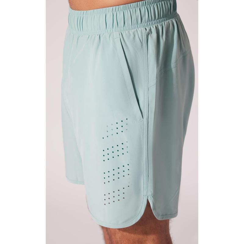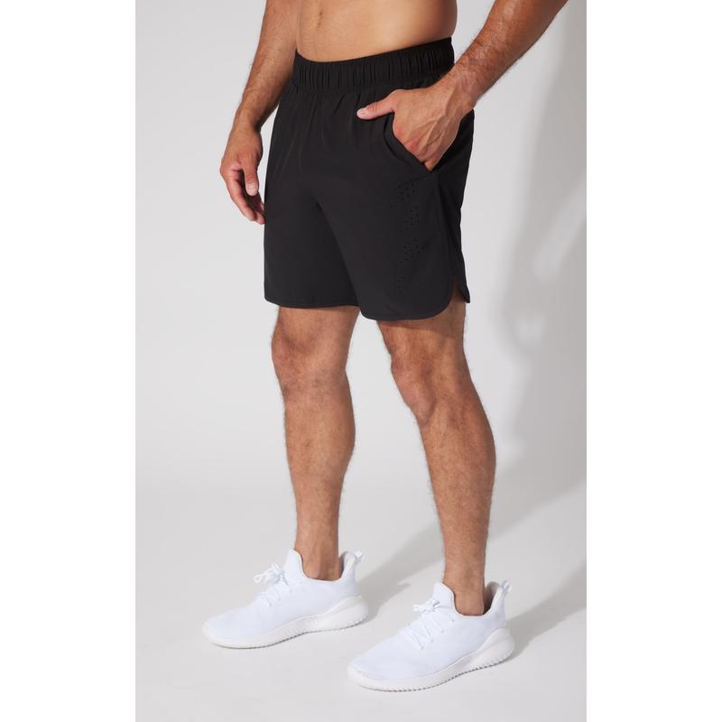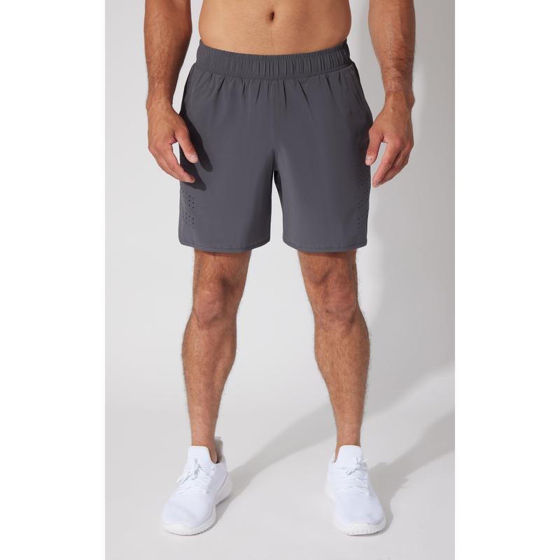 These Mens 7" shorts feature a perforated design and front pockets, providing breathability and convenience during physical activity. Expertly woven, they offer both functionality and style. Perfect for the active man looking to stay cool and prepared on the go. Back waistband zipper pocket.