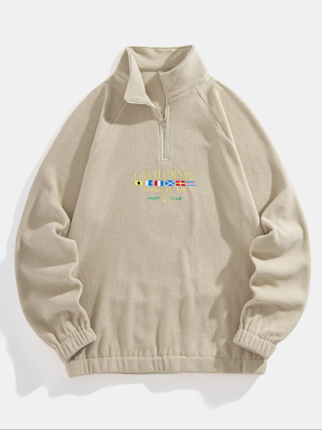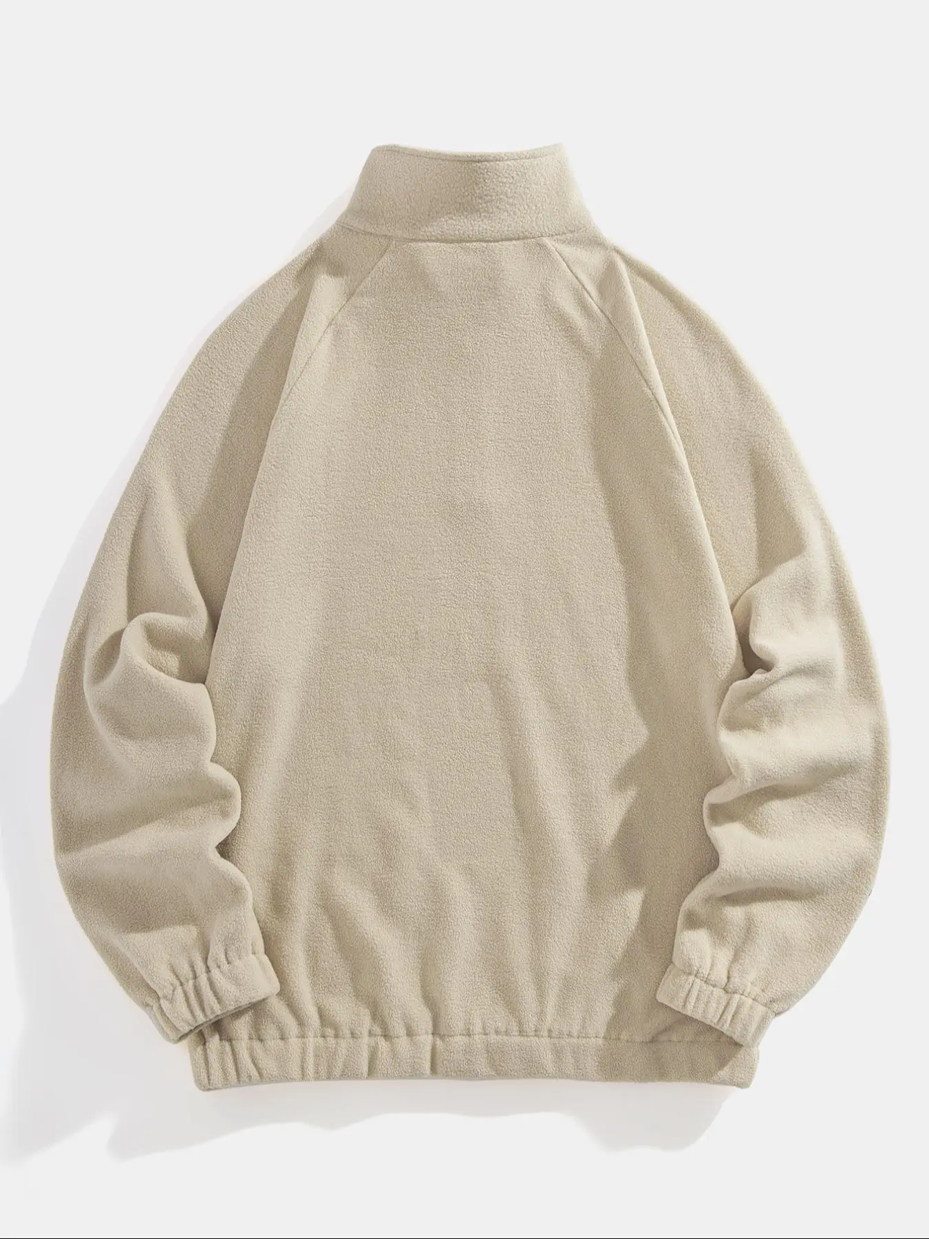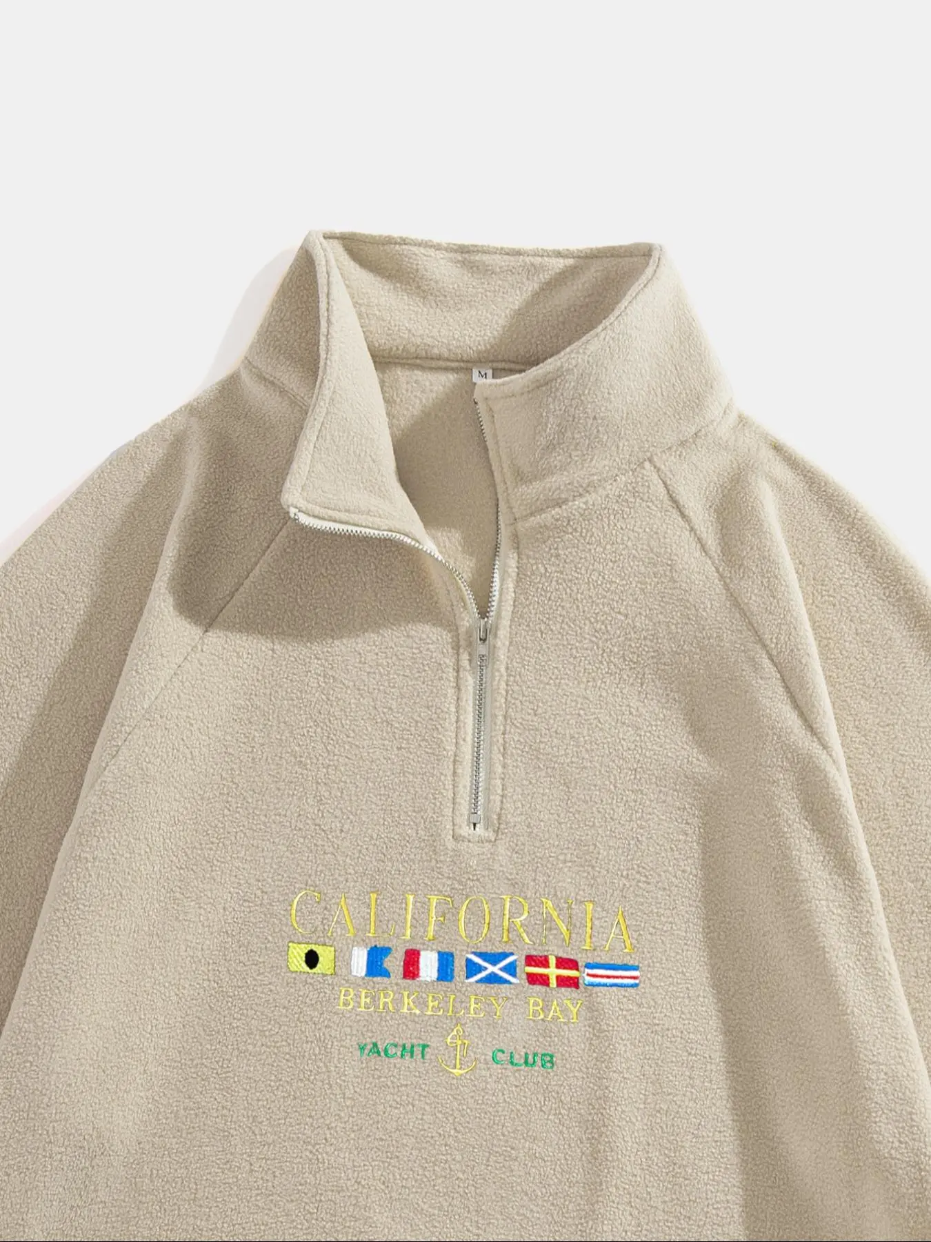 Runs a bit small, feels good has a good fleece texture the zip is good quality good for the price looks solid