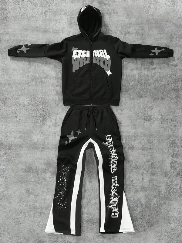 Men's Colorblock Star & Slogan Graphic Print Zip Up Sweatshirt & Drawstring Waist Sweatpants Set, Regular Fit Casual Streetwear Long Sleeve Hooded Sweatshirt & Pocket Flare Leg Pants, Men's Two-piece Outfits for Daily Wear, Sets for Men Clothing