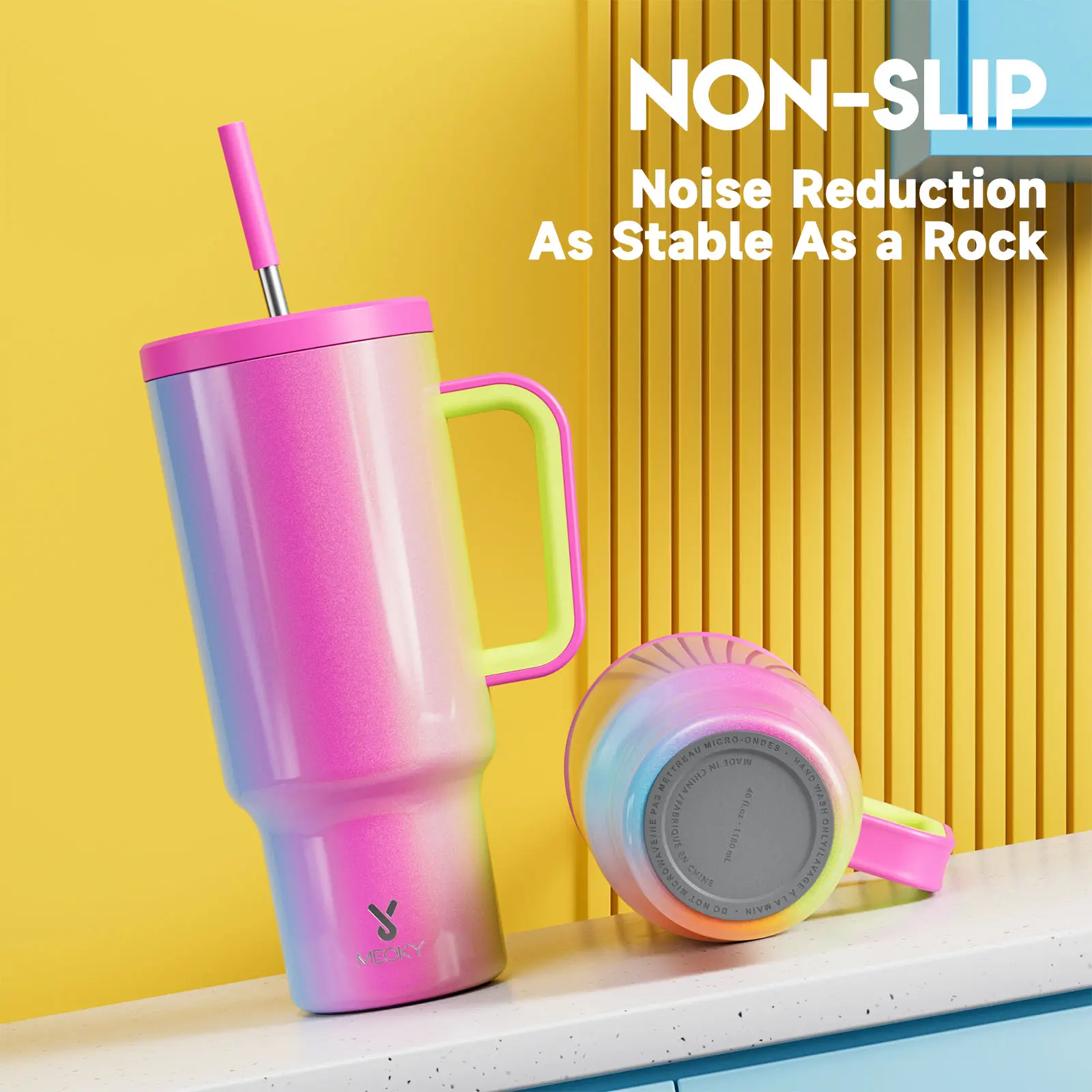 I absolutely love my MEOKY Cup. The colors are beautiful,gives a total Lisa Frank vibe with a shimm,it keeps my water iced cold and is also leak proof when the staw is out, and obviously will leak some when the straw is in,The cup is a perfect size and it also has a silicone bottom which is great