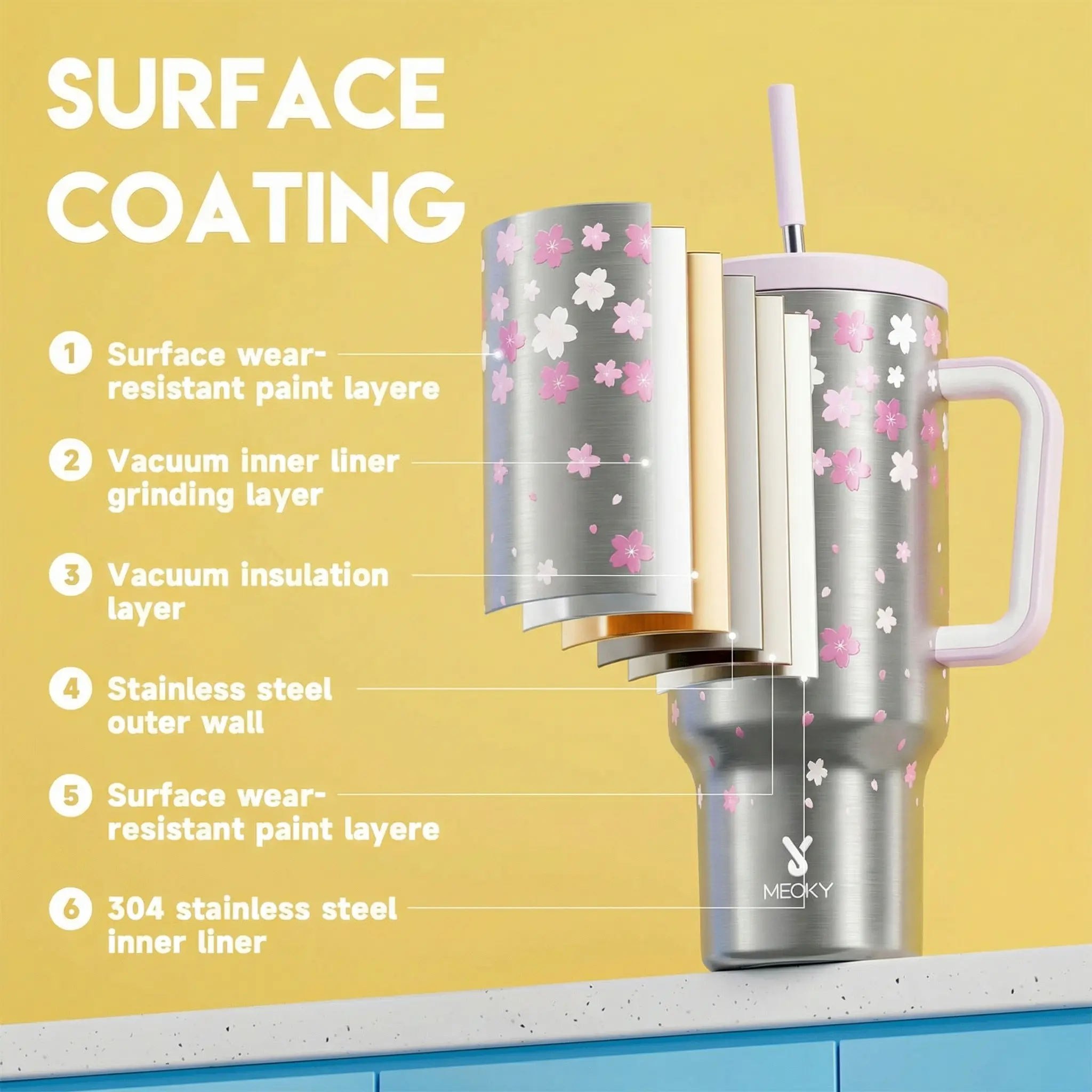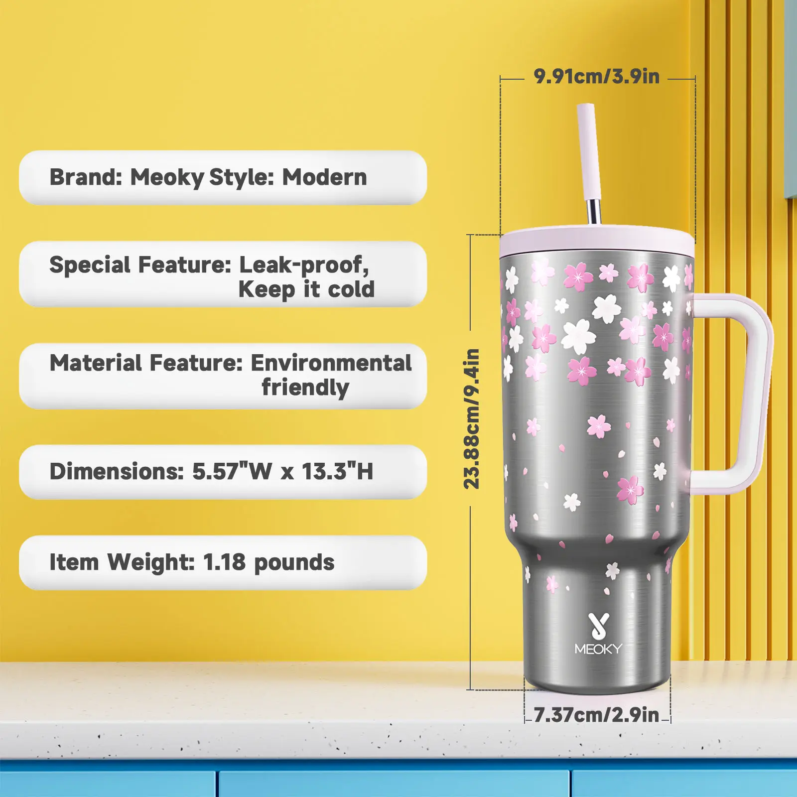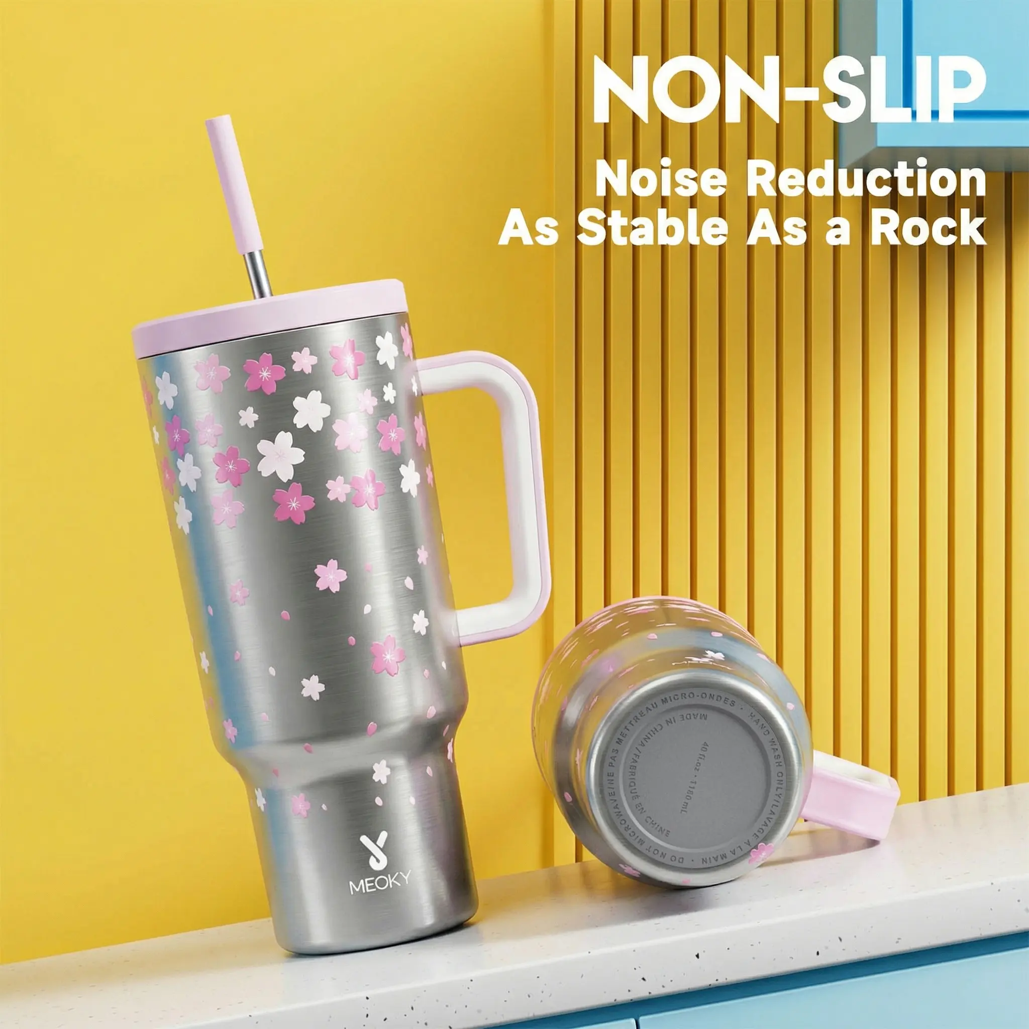 Love love my Meoky! This style was so amazing and perfectly girly for me. I have several from this brand and they are better than Stanley’s. I have ice still in my cup over night and in the Texas heat. The paint never scratches and the rubber on the bottom keeps it upright!