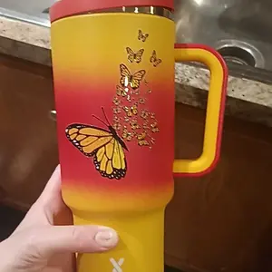 Mecky is my favorite cup companies. I absolutely love them.This color n designis just stunning. they’re a little bit 3-D n they’re all very well made. I do choose to put a glass straw in them. Because I don’t like the Metal one it comes with, they fit in my cupholder in the car! N a rubber bottom!