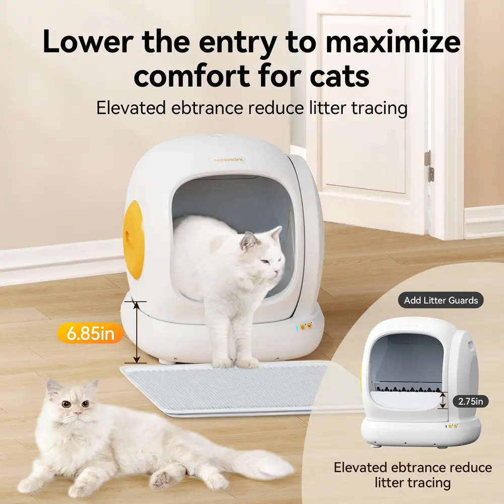 Large Space & Open Design: The self-cleaning litter box has a spacious 75L capacity and open design, suitable for cats 3.3–18 lbs. Its 6.8-inch low entrance is ideal for short-legged, overweight, and senior cats.