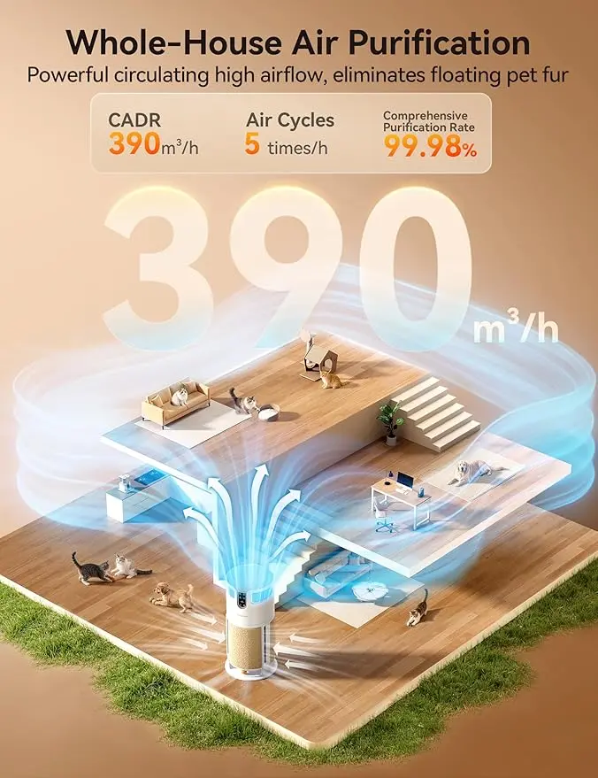 Whole-House High-Efficiency Air Purification: Our air purifier uses a 3D air duct + turbocharging accelerates air circulation, purifying the air 5 times per hour with high-speed airflow. Suitable for large spaces up to 3900 square feet, creating a smoke-free, dust-free, and odor-free living environment for your family and furry friends