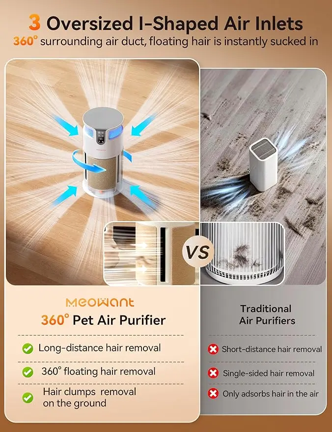 360° Surround Hair Suction with Anti-Clog Inlet: Air cleaner features 3 large I-shaped long air inlets — unlike traditional grille/round inlets that easily get clogged with pet hair and are hard to clean, our anti-clog design resists hair clogs, sucking it in and filtering it out instantly. The 360° wrap-around air duct comprehensively sucks floating pet hair from the air and floor, and even efficiently removes hair clumps on the ground from a distance.
