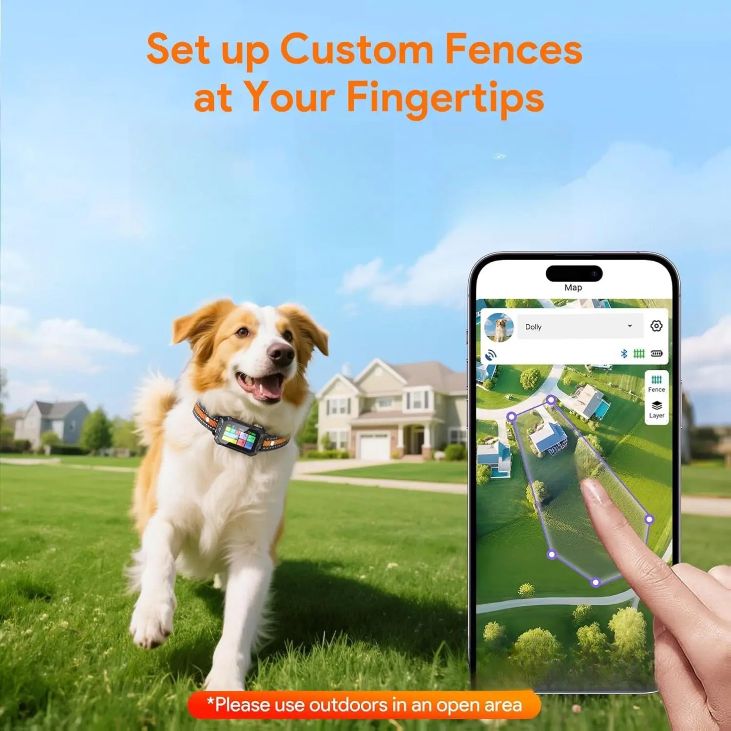 ·Create Custom Fence via Free App: Keep your dog safe without buried wires or monthly fees! With the Meowant GPS Wireless Fence, set up a virtual fence effortlessly using our free app. Choose round or polygonal shapes, covering areas from 0.48 to 3,534 acres, fences can be zoomed and adjusted. Also you can set up a round fence by single collar. Plus, track your dog's location within Bluetooth range (≤98 ft)directly from your mobile. Setting up the wireless fence requires an open outdoor area with strong GPS signal. If the product malfunctions due to insufficient GPS signal in your area, please contact us.
