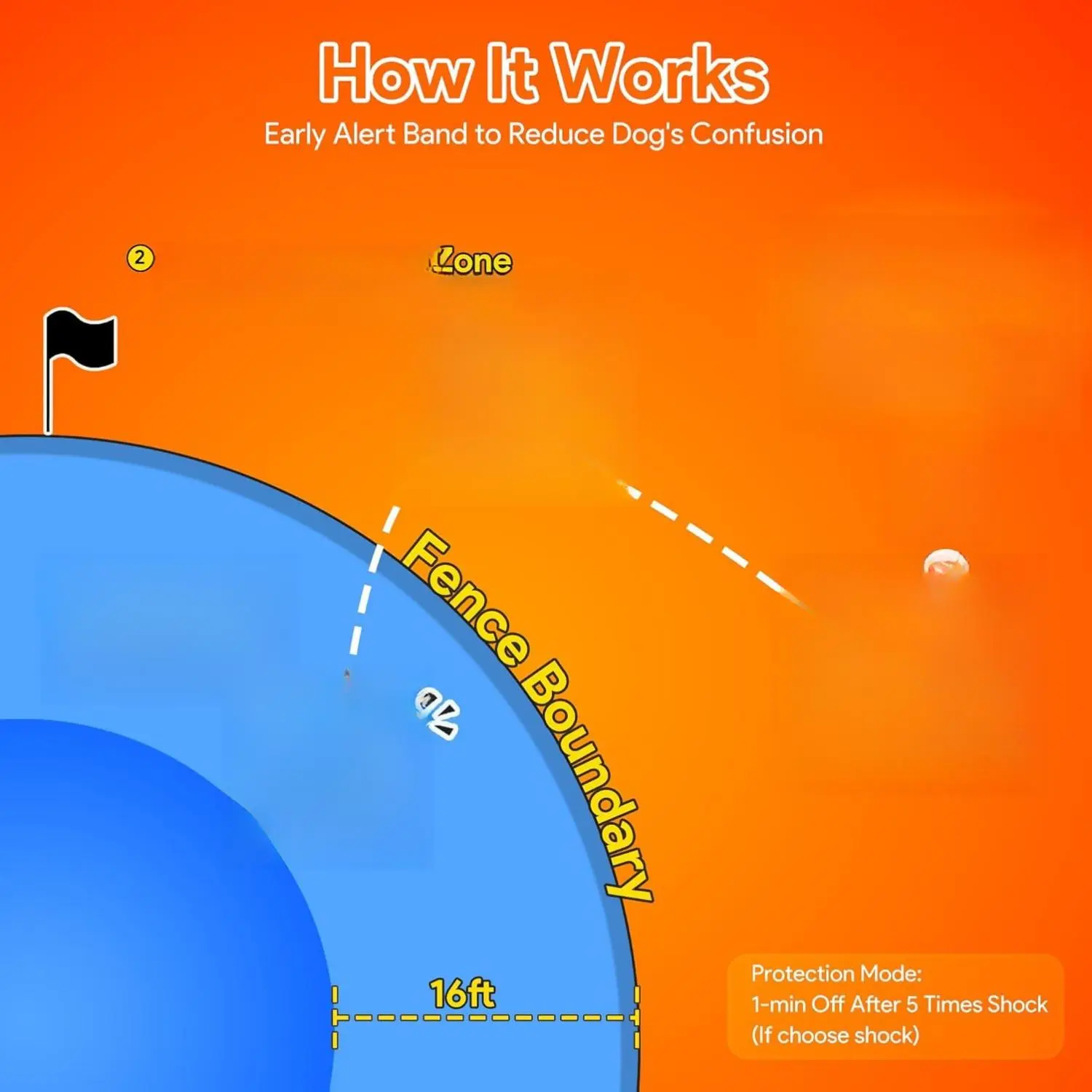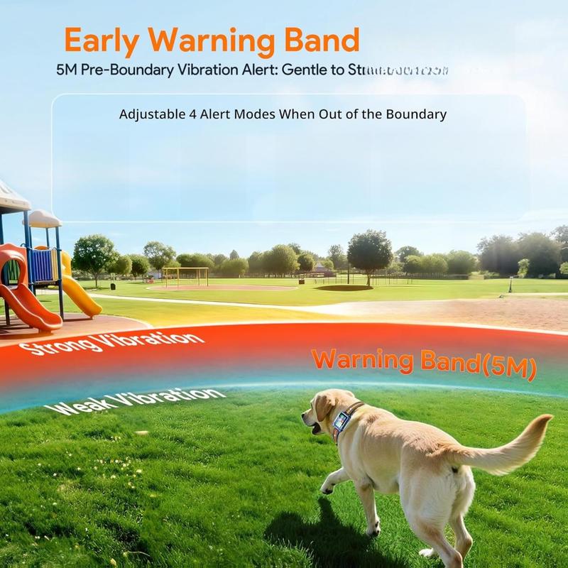 ·Innovative Early Warning Band: 5 meters before your dog approaches the edge of the virtual fence, there will be a vibration warning that gradually increases, minimizing your dog's confusion and anxiety. When your dog escape the fence, you can choose from 4 warning modes: beep, vibration, beep + vibration, and customizable static stimulation, each with 5 intensity levels