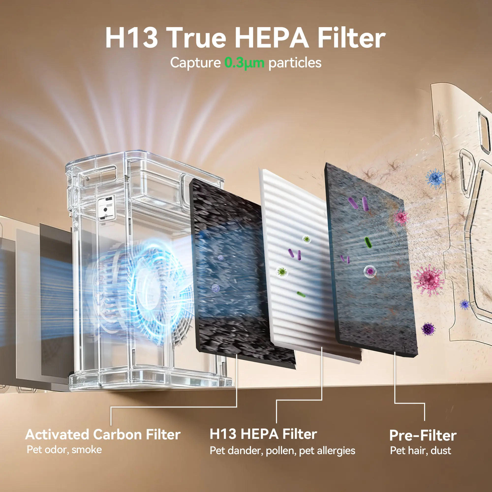 6-Layer True HEPA Filtration: Inside 2 true H13 HEPA filters filter 99.97% of airborne particles down to 0.3μm. It's 6-stage purification rapidly refreshes the air in minutes. Paired with an activated carbon filter instead of carbon cotton, it also absorbs tough odors from cat litter boxes, dog smell, pet urine, vaping and cooking—leaving your home fresher (Pls remove plastic packags of filters before first use)