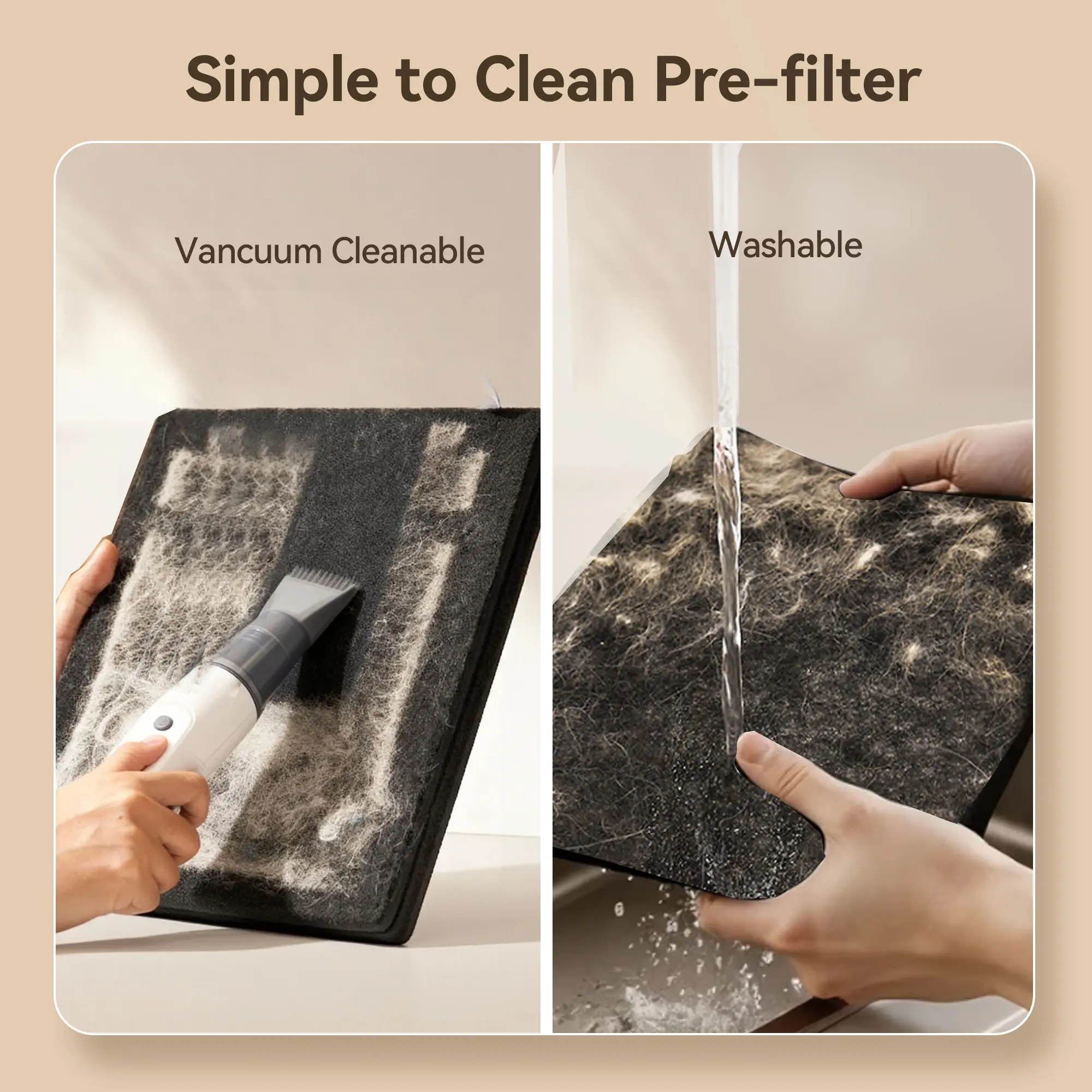 Washable Pre-Filters for Easy Maintainance: Unlike standard 3-month filters, our reusable electrostatic pre-filters can be vacuumed or rinsed—extending the HEPA filter's life to 6 months and saving you money over time (Pls purchase Meowant official replacement filter for well product performance) Unit: 7" × 11.8" × 16.1".