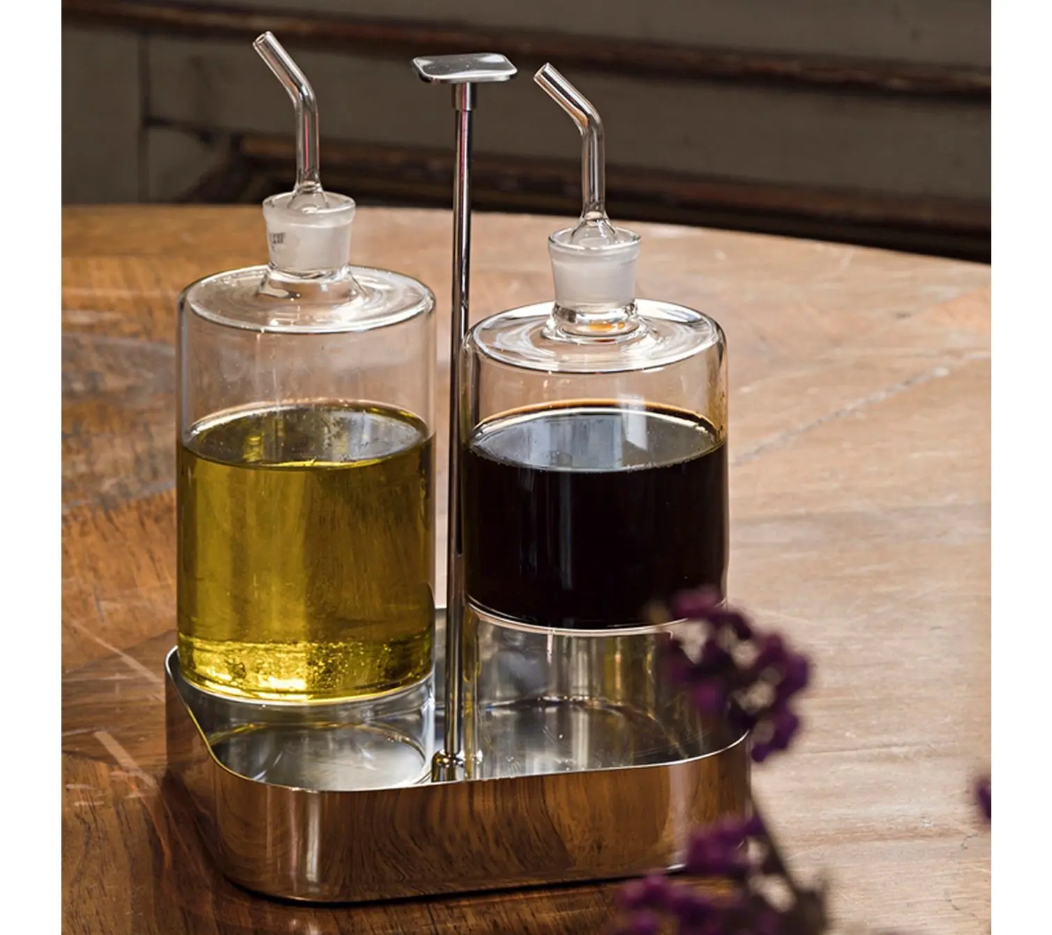 Sharing salads or antipasto platters with friends feels a bit more special with this two-piece condiment set by Mepra, designed in collaboration with Pininfarina to blend sleek contemporary lines with Italian flair. Whether drizzled over leafy greens or displayed on your dining table, these stainless steel oil and vinegar bottles add a refined touch to every meal. From Mepra.