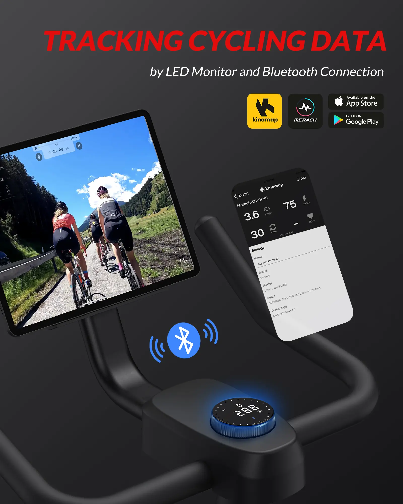 Merach Bike seamlessly combines indoor cycling with music! Download the FantomFite app at FantomFite.com, connect your bike, and enter RPM Game Mode to match your cadence to music for higher scores. Enjoy social rides and fresh tracks monthly!