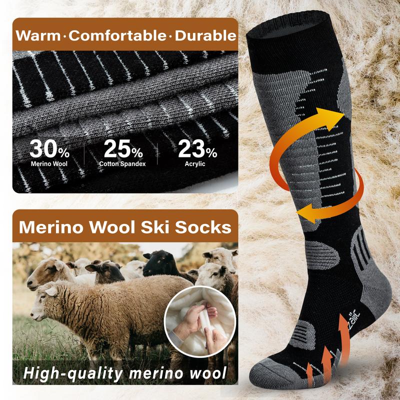 ·【Merino Wool Ski Socks】: Thermal ski socks for womens and mens are made of Merino wool, Polyester Fiber, Cotton spandex which has excellent thermal insulation, comfort, and breathability, keeping your feet extra warm during winter skiing or outdoor sports. Perfect for outdoor work, Motorcycle, Cycling, Ski, Mountain Climbing, Hiking, Camping, Hunting, Ice Fishing or playing winter sports.