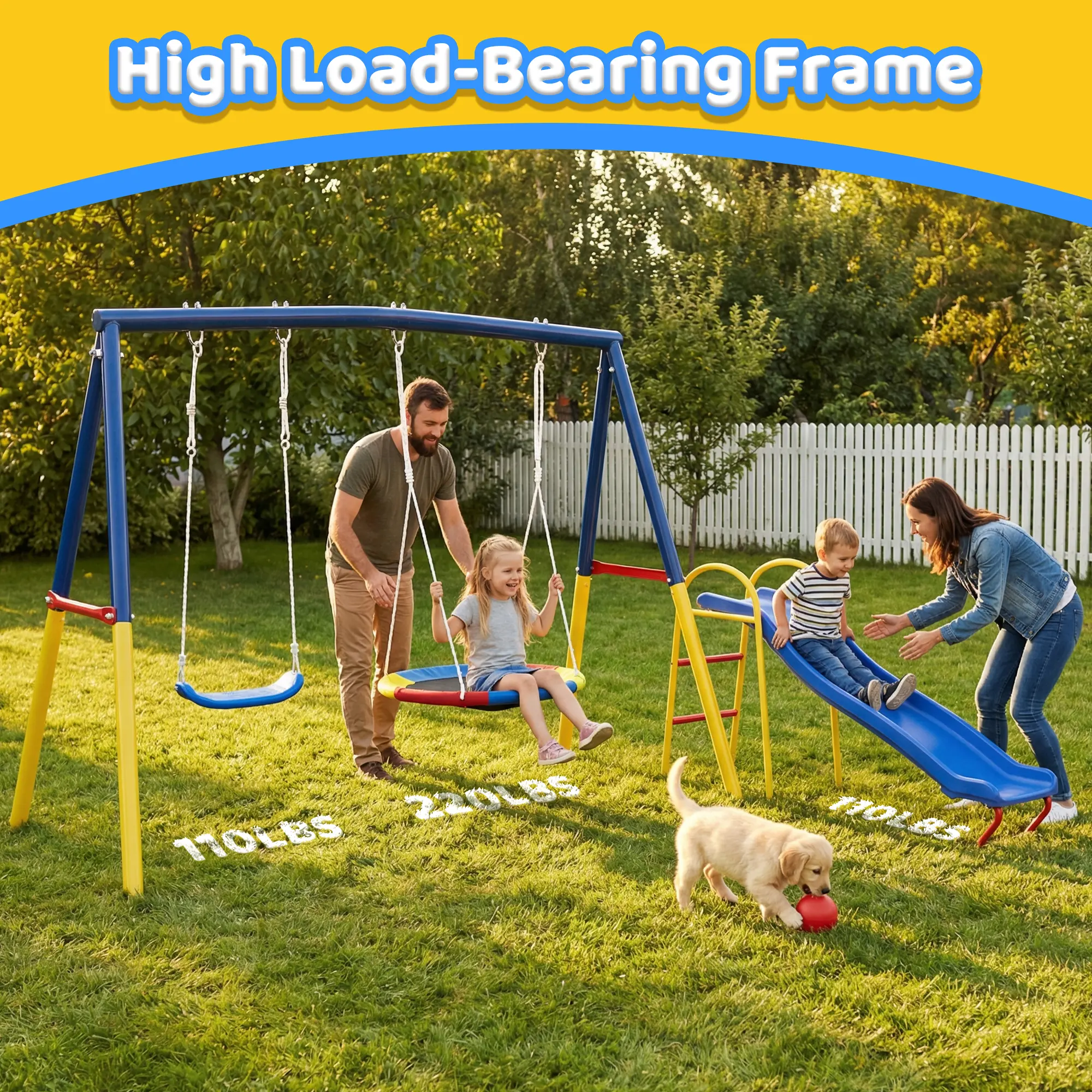 Ā·ćUltra-safe and Sturdy Swing FramećThis swing stand features a sturdy A-frame structure and extremely high-quality ground anchors, which can support up to 440 pounds, and is well-made to ensure safety and comfort when your children are playing wildly, and the steel hardware reinforced inner pipe joints are more sturdy and durable. With powder-coated paint finish for greater durability; the A-frame ensures extra stability.