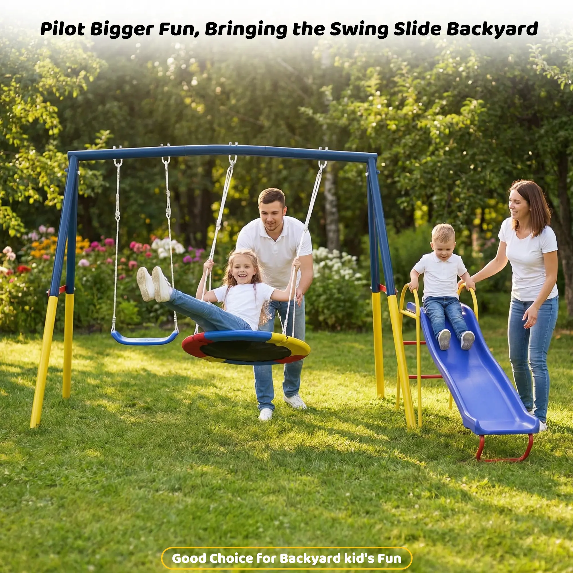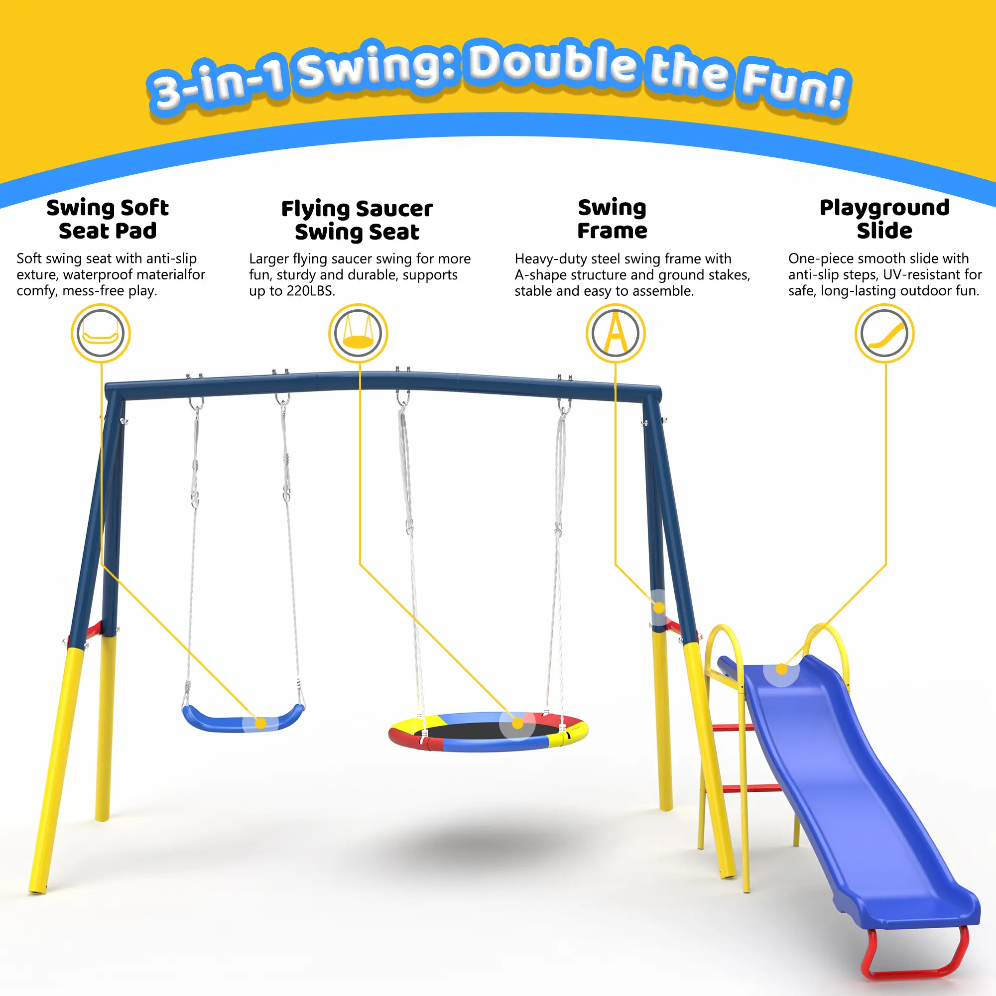 Ā·ćIdeal Gift for Kidsć This UFO Swing Set is a perfect gift for kids and friends. The outdoor swing set makes your kids feel more fun, and the bright colors make kids' games more interesting. If you have any questions, please feel free to contact us.