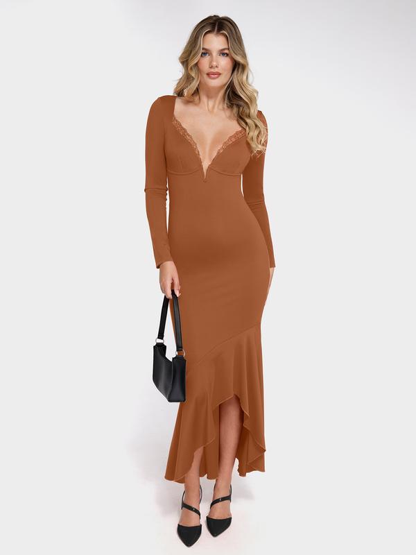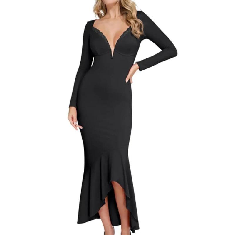 The Popilush Shapewear Long Sleeve Lace Trim Mermaid Maxi Dress seamlessly combines elegance and versatility, making it perfect for a wide range of occasions. Pair it effortlessly with a jean jacket or other outerwear for a chic, stylish look that suits any event.