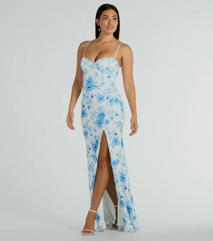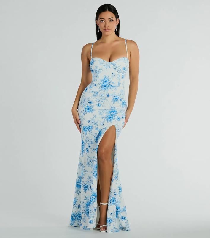 Floral beauty meets a stunning silhouette in the Elia high slit floral crepe mermaid dress, perfect for formal spring and summer parties! The crepe fabric is detailed with a gorgeous floral bouquet print and a full-length smooth knit lining. She features a sleeveless sweetheart neckline with a built-in padded bust and a chic corset-style bodice with structured underwire and flexible boning. Her adjustable spaghetti straps offer a customized fit, leading to a secure back zipper closure. Her floor-length mermaid fit is accented with a high-cut front slit to showcase some leg. Complete the look with dainty duster earrings.