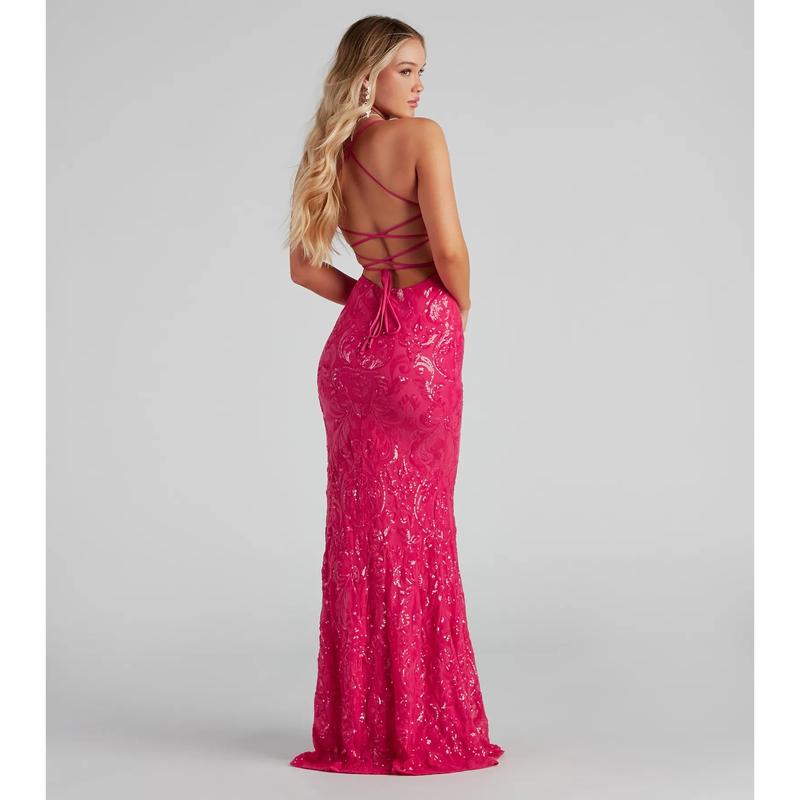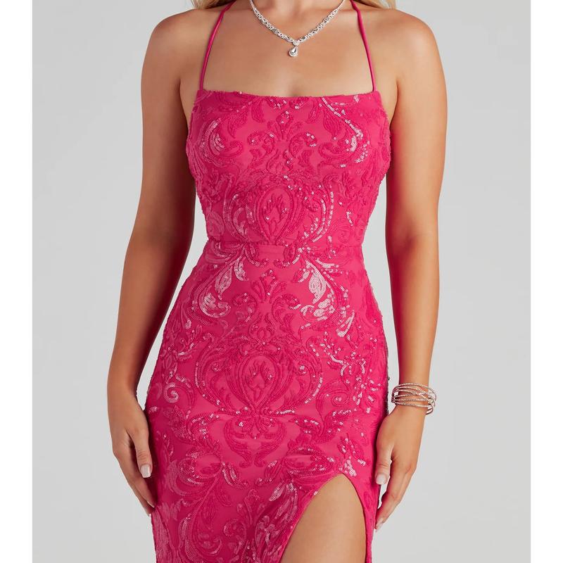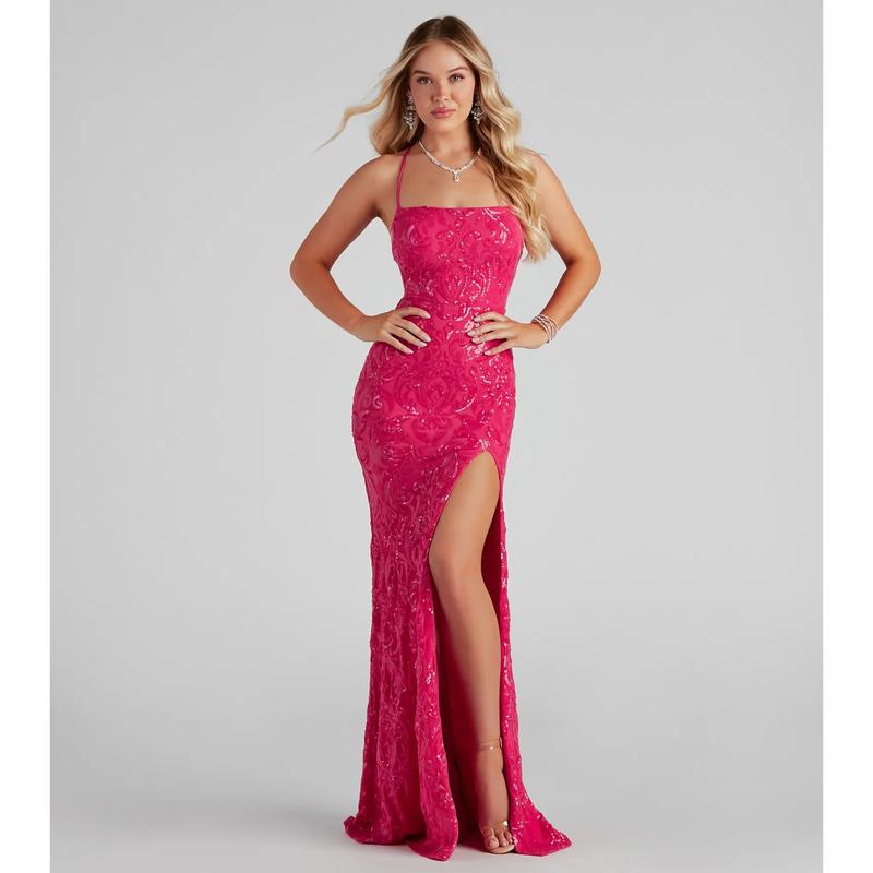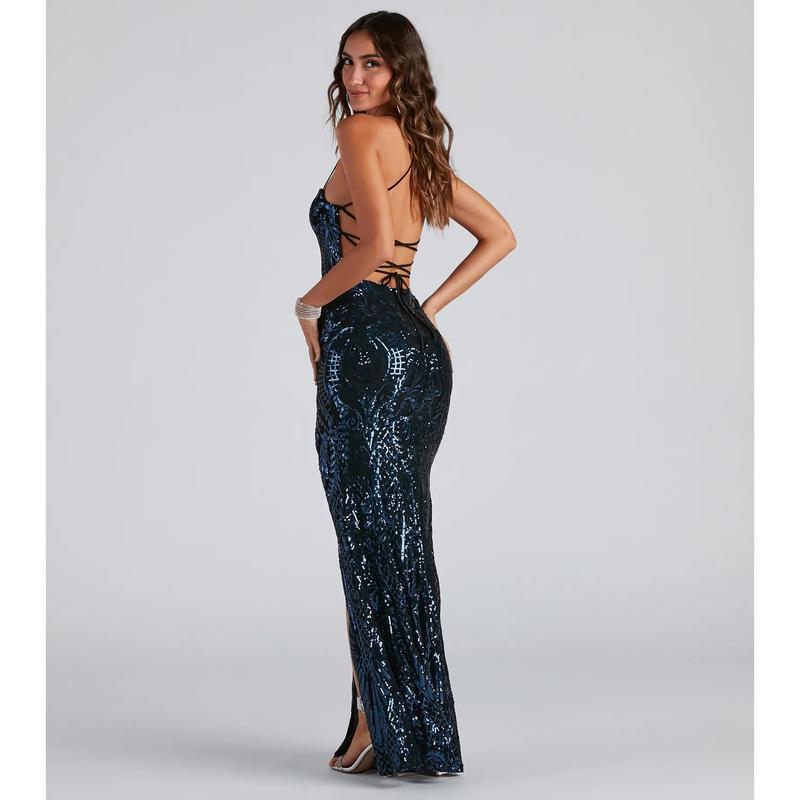 Chic and glamorous, the Rowena sequin mermaid long dress will stylishly elevate your formal night-out look. With a lace-up strap design and fitted mermaid silhouette with a high slit, you'll deliver stunning style.